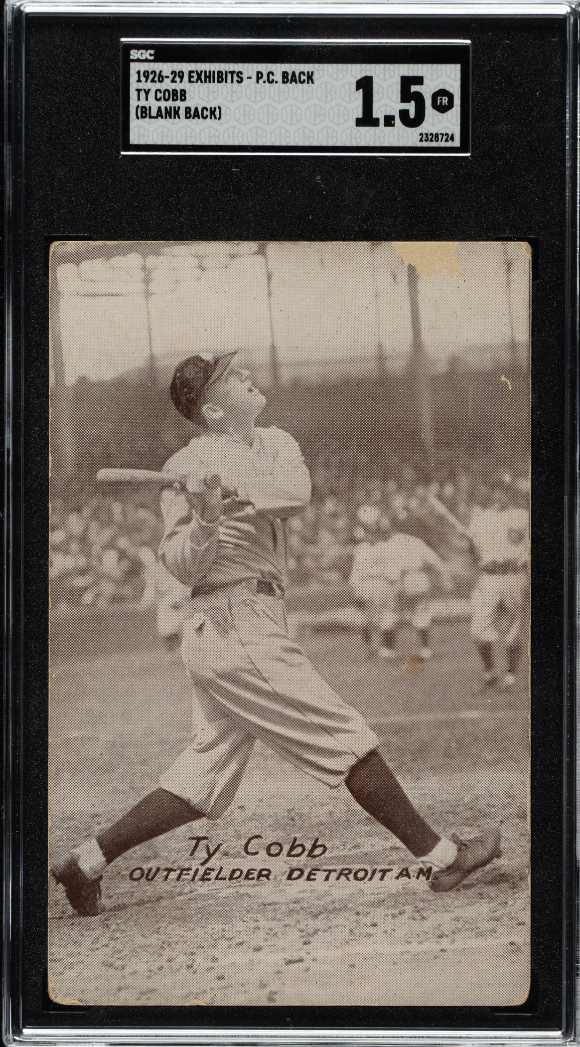 Graded FAIR 1.5 by SGC. Detroit Tigers Hall of Famer Ty Cobb. This classic Exhibit-style card was actually issued by a small competitor of the Exhibit Supply Company. The cards were issued two ways: with or without a normal postcard indicia on the reverse. The offered example is the "Blank Back" variety. A small area of paper loss along the top edge contributes to the assigned grade.