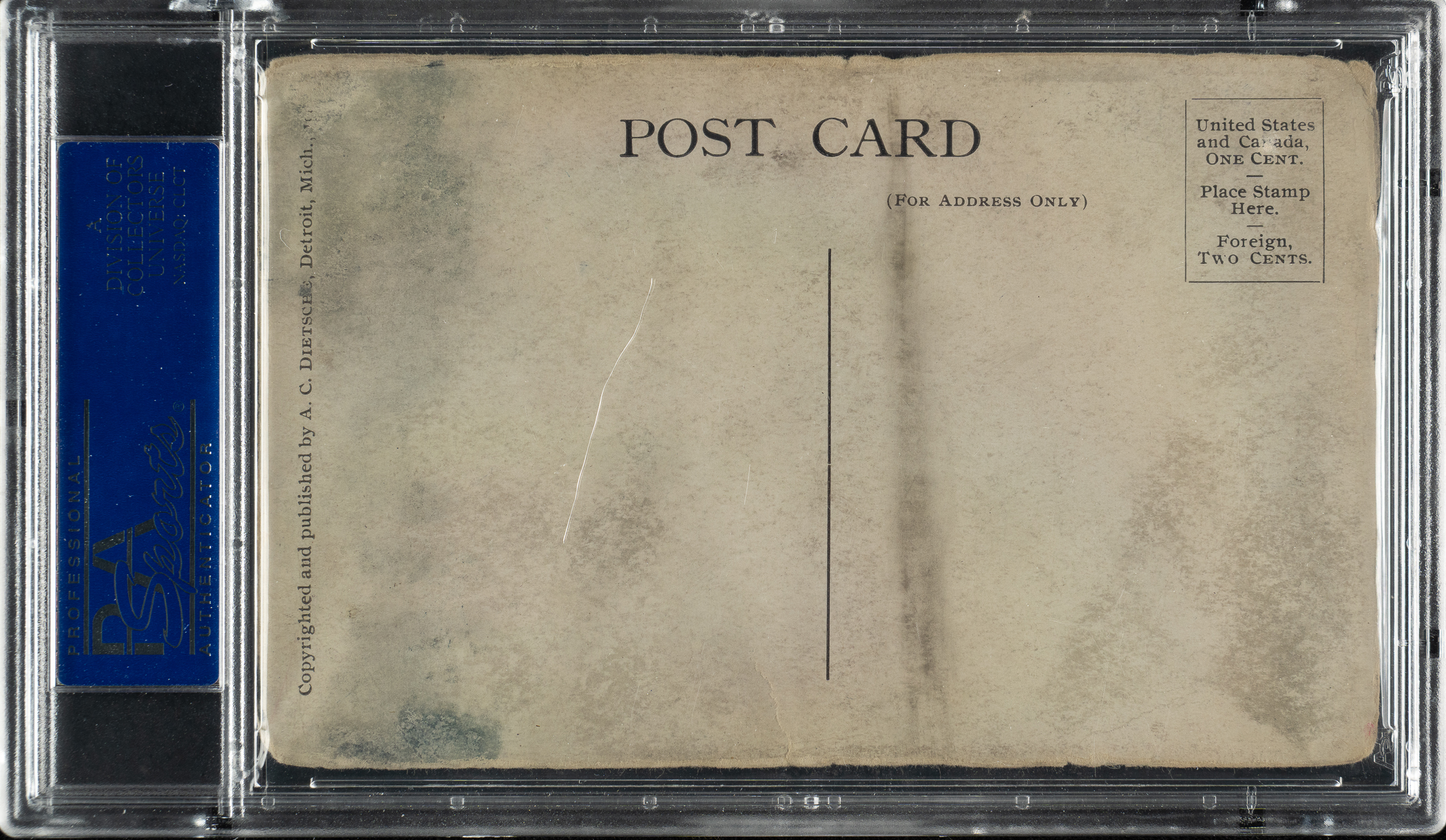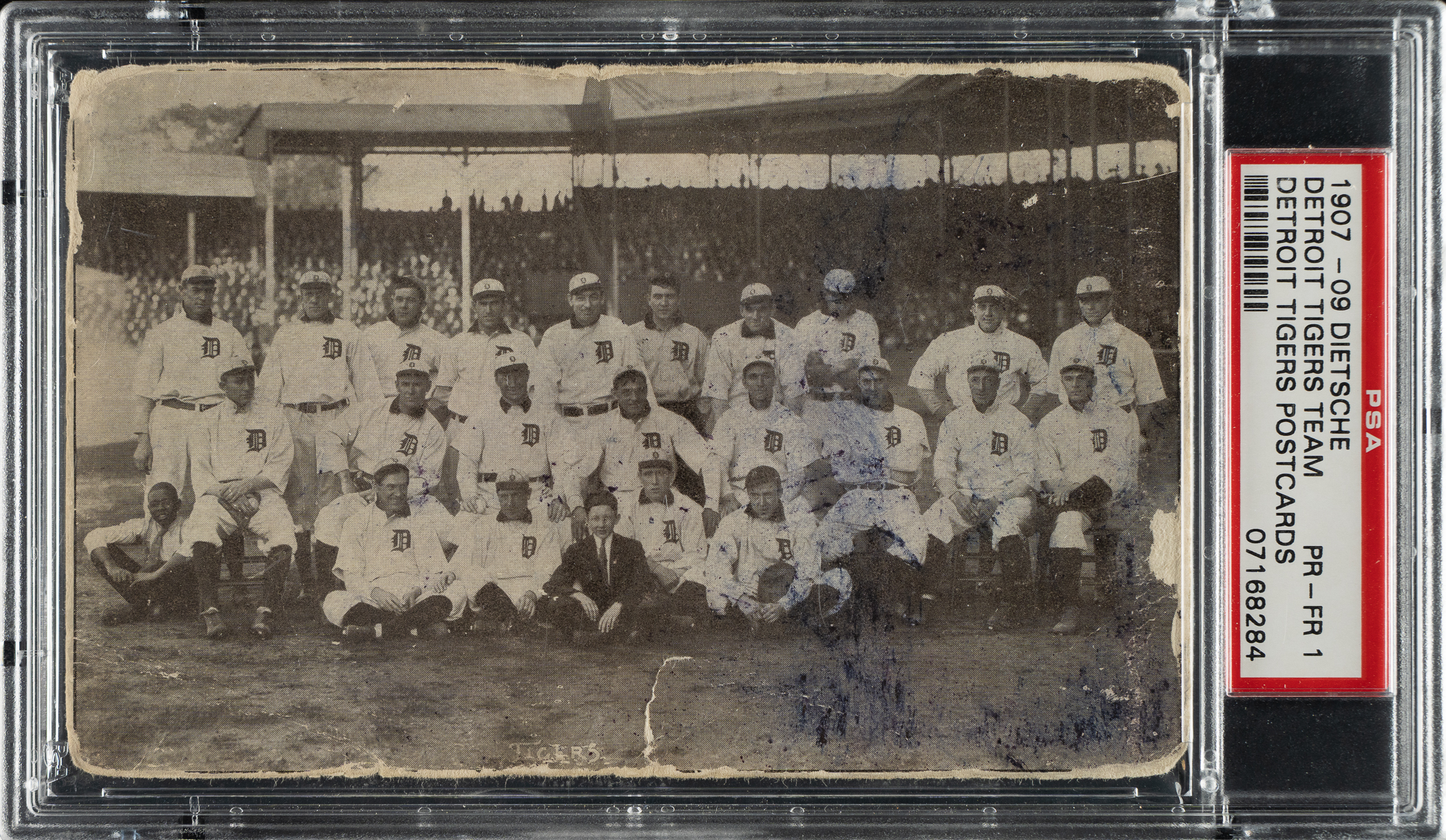 Scarce real-photo postcard capturing the Detroit Tigers in a classic team pose issued in 1909 by A. C. Dietsche. Twenty-two team members are pictured posing on the field in front of the grandstand, including Ty Cobb, manager Hughie Jennings, Sam Crawford, and George Mullin. The Dietsche Detroit Tigers postcard set, which consists of 42 cards, was issued in three series from 1907 to 1909. The team card offered here is one of the four cards issued in the final series in 1909. The postcard (5.5 x 3.5 inches) has a number of moderate creases, heavy corner and edge wear, and ink marks on the front. There is no writing on the reverse. Graded POOR 1 by PSA.