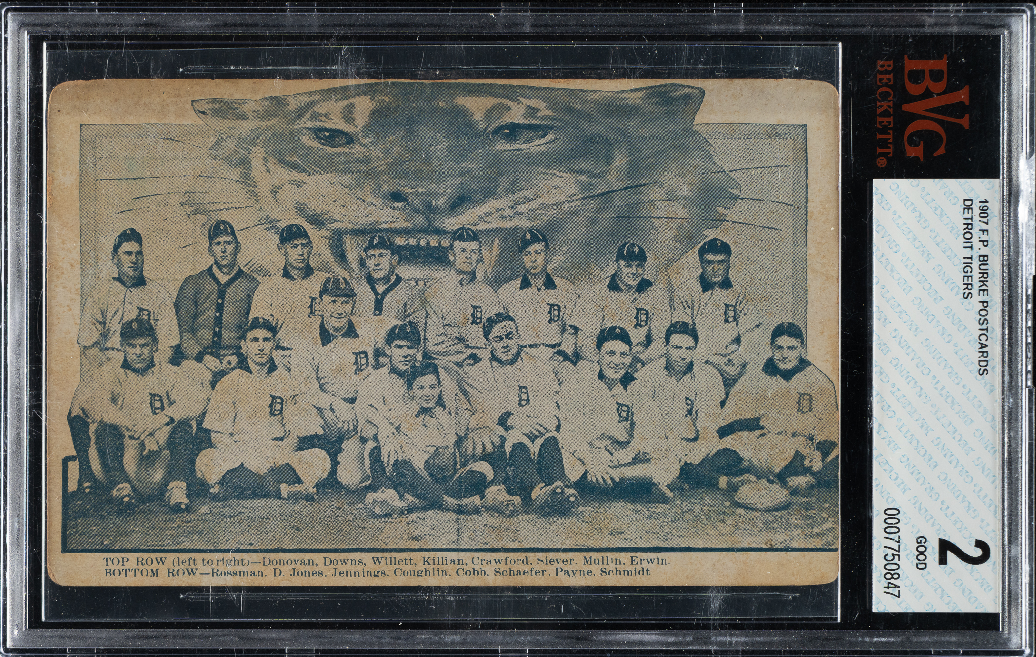 Scarce postcard capturing sixteen members of the 1907 American League Champion Detroit Tigers in a classic team pose, including Ty Cobb, Sam Crawford, manager Hughie Jennings, Davey Jones, Ed Killian, George Mullin, and Germany Schaefer. What makes this particular postcard so striking is the unique background design that features the superimposed image of a Tiger. This is just the fifth example of this particular Detroit team postcard we have offered in the past 22 years. All of the players are identified in print along the white base. The name of the manufacturer, “F. P. Burke,” is printed on the reverse. The card has not been addressed or mailed. The card (5.5 x 3.5 inches) has light creasing and even corner wear. Graded GOOD 2 by BVG (Beckett). This is a desirable Detroit Tigers souvenir dating from Ty Cobb’s second full season and the first of three consecutive American League championships for the club.