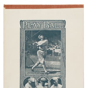 In "the olden days," notebooks with stars such as Babe Ruth or Ty Cobb on their covers were very popular with youngsters at school. Offered here is an early example titled "Play Ball," featuring “Shoeless” Joe Jackson as a member of the Chicago White Sox. Jackson is pictured taking a swing in a batting cage, with his name and team affiliation printed directly below his image. Displayed beneath the larger Jackson photo are portrait images of Tris Speaker, Edd Roush, and Carl Mays. Given the players featured here, this notebook most likely dates from around 1917, when all of these players were in the prime of their careers. The notebook (7.75 x 9.75 inches), which contains 15 lined sheets of paper, displays a light moisture stain in the lower left corner of the front cover as well as light wear. In Very Good to Excellent condition. This is an outstanding example of this popular baseball notebook and one that is perfect for display.