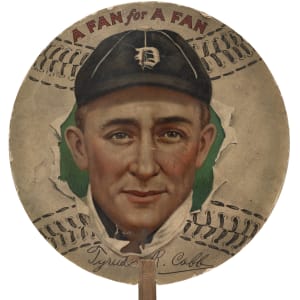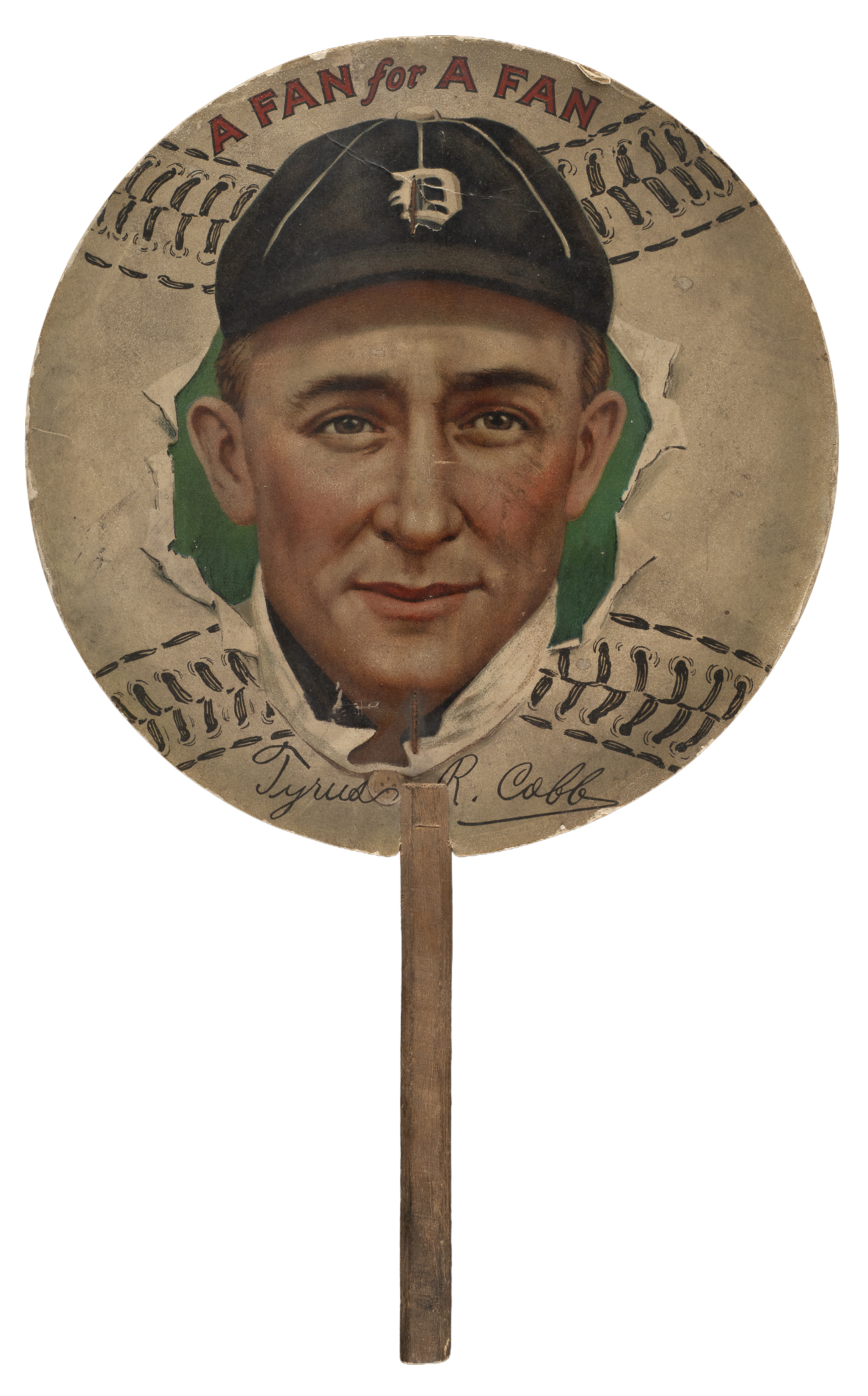 Exceedingly rare Ty Cobb fan from the popular "A Fan For A Fan" series, issued circa 1913. Cobb is one of five players featured in the scarce "A Fan For A Fan" series, along with Christy Mathewson, Hal Chase, Larry Doyle and the newly discovered Frank Baker. Prior to the discovery of the Baker fan, Cobb was always considered the most valuable of the group and the "key" to acquiring a complete set. The colorful design for each fan in the series features a beautiful full color portrait of the respective player set against a baseball design with the heading "A Fan For A Fan" above the portrait. A facsimile signature of the respective player appears below. The striking design and colorful graphics of this set make it one of the most attractive of all early baseball issues. It should be noted that reproductions of these fans are extremely common and many have been artificially aged. Because the reproductions are so commonly encountered on eBay and at flea markets, some collectors might underestimate just how rare the originals are. The reproductions are everywhere, but authentic examples are seldom seen! We have offered only two examples in the past 22 years! (This example appeared as Lot 2005 in our Spring 2019 auction, where it realized $20,400.) Both the front and reverse of the fan display moderate surface wear, including what appears to be a light, faded pencil signature (possibly erased) on Cobb's left cheek. Minor border wear and a few tiny abrasions are also evident along the front. In Very Good condition overall. Diameter: 7.25 inches. Handle length: 5.25 inches.