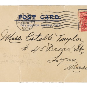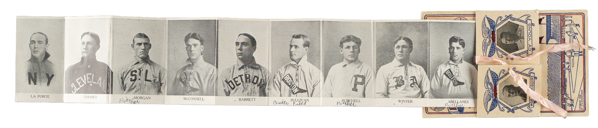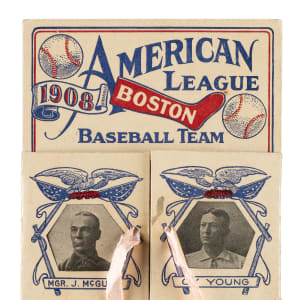 Exceedingly rare 1908 Boston Red Sox fold-out postcard. This is one of two different Boston Red Sox fold-out postcard issued in 1908, but this design is far more attractive and scarcer than its counterpart. This is only the second example of this particular postcard we have ever offered. The colorful design features the year and team logo at the top and a game-in-progress illustration along the base. In the center are two flaps bearing, respectively, the portrait images of Cy Young and manager Deacon McGuire. The flaps open up to reveal individual portrait images of 18 additional team members (stacked accordion style), with nine players on each side. Included here are Eddie Cicotte, Jake Stahl, Bill Carrigan, Heinie Wagner, Lou Criger, Harry Lord, Doc Gessler, Amby McConnell, Jack Thoney, and Cy Morgan. Each player is identified in print below his image. A 1908 copyright by “H. N. Dickerman” appears on the front in the lower left corner. The postcard (3.5 x 5.5 inches), which includes its original ribbon closure on the front, has been addressed and mailed, with the postmark dated “Boston, Mass. Aug. 24 1908.” There is an ink notation on the inside flap of the McGuire portrait. Twelve of the player portraits on the interior pages have the player's name scripted in black ink. In Fair condition overall. Despite its technical grade, this is an outstanding example of this great rarity and one that would be a welcome addition to any advanced Boston Red Sox collection.