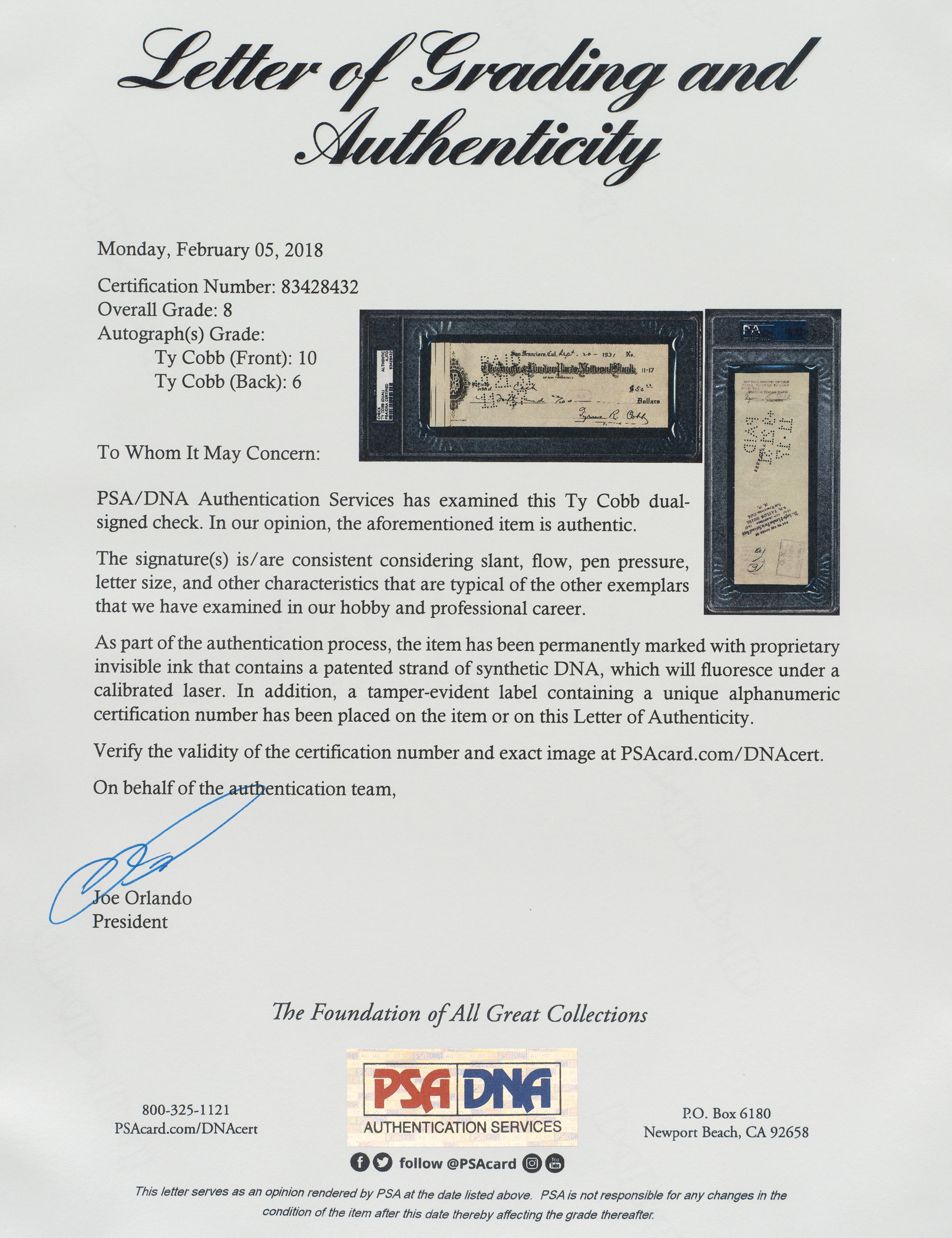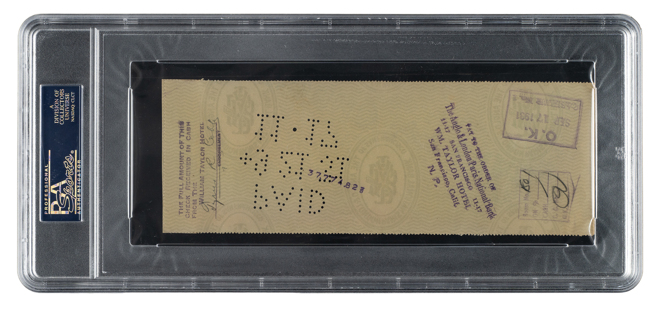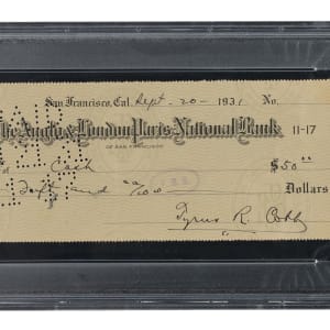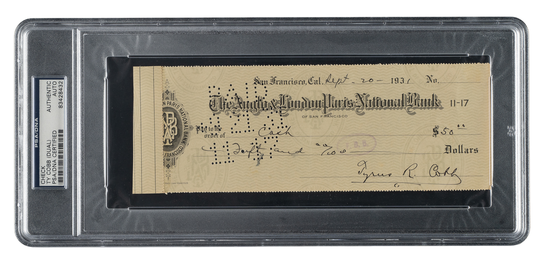 Bank check dated September 20, 1931, and signed in black ink twice by Hall of Fame outfielder Ty Cobb. The check, drawn on The Anglo & London Paris National Bank, is made out to “Cash” in the amount of $50. Signed “Tyrus R. Cobb” along the base and again on the reverse as an endorsement. PSA/DNA has encapsulated the check, grading the Cobb signature on front as GEM MINT 10 and the second Cobb signature on the reverse as EX-MT 6. The combined grades result in the overall NM-MT 8 assessment by PSA. The check (8.5 x 3 inches) has normal bank cancellation stamps and perforations as well as a few light creases. Also, a portion of the check ledger book (three-quarters of an inch) has been affixed to the left side of the check. In Very Good condition overall. Full LOA from PSA/DNA.