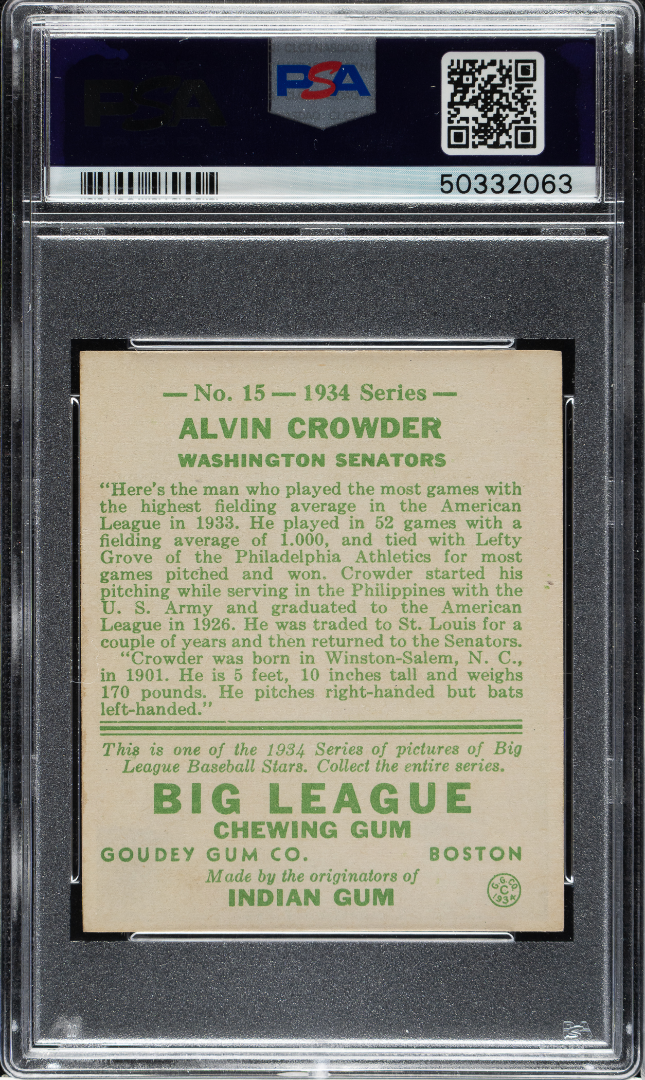 Lot # 1504: 1934 R320 Goudey #15 Alvin Crowder PSA NM+ 7.5