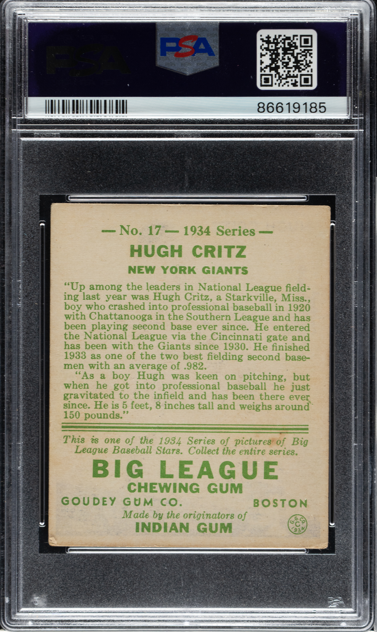 Lot # 1505: 1934 R320 Goudey #17 Hugh Critz PSA VG 3