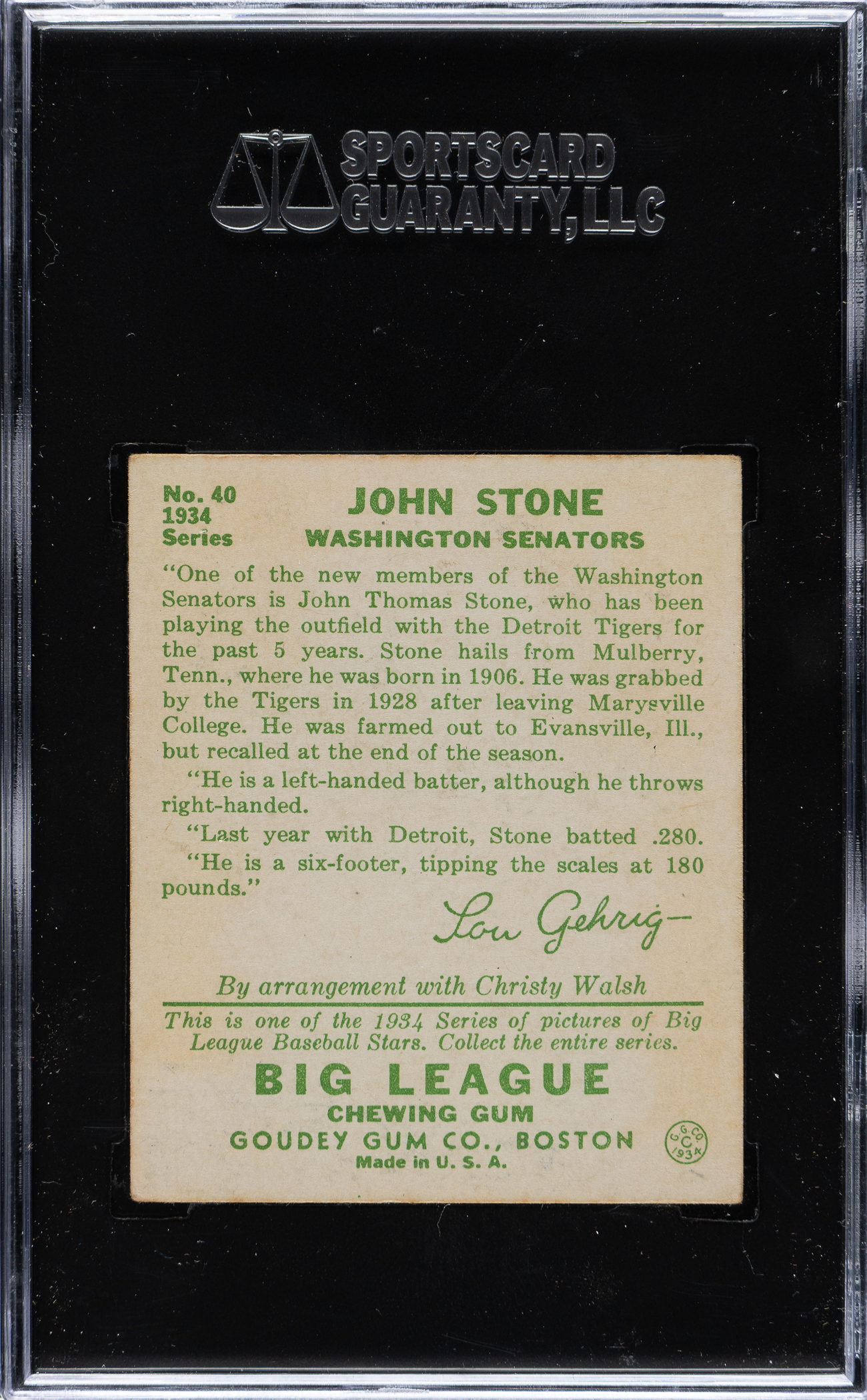 Lot # 1515: 1934 R320 Goudey #40 John Stone SGC EX 60