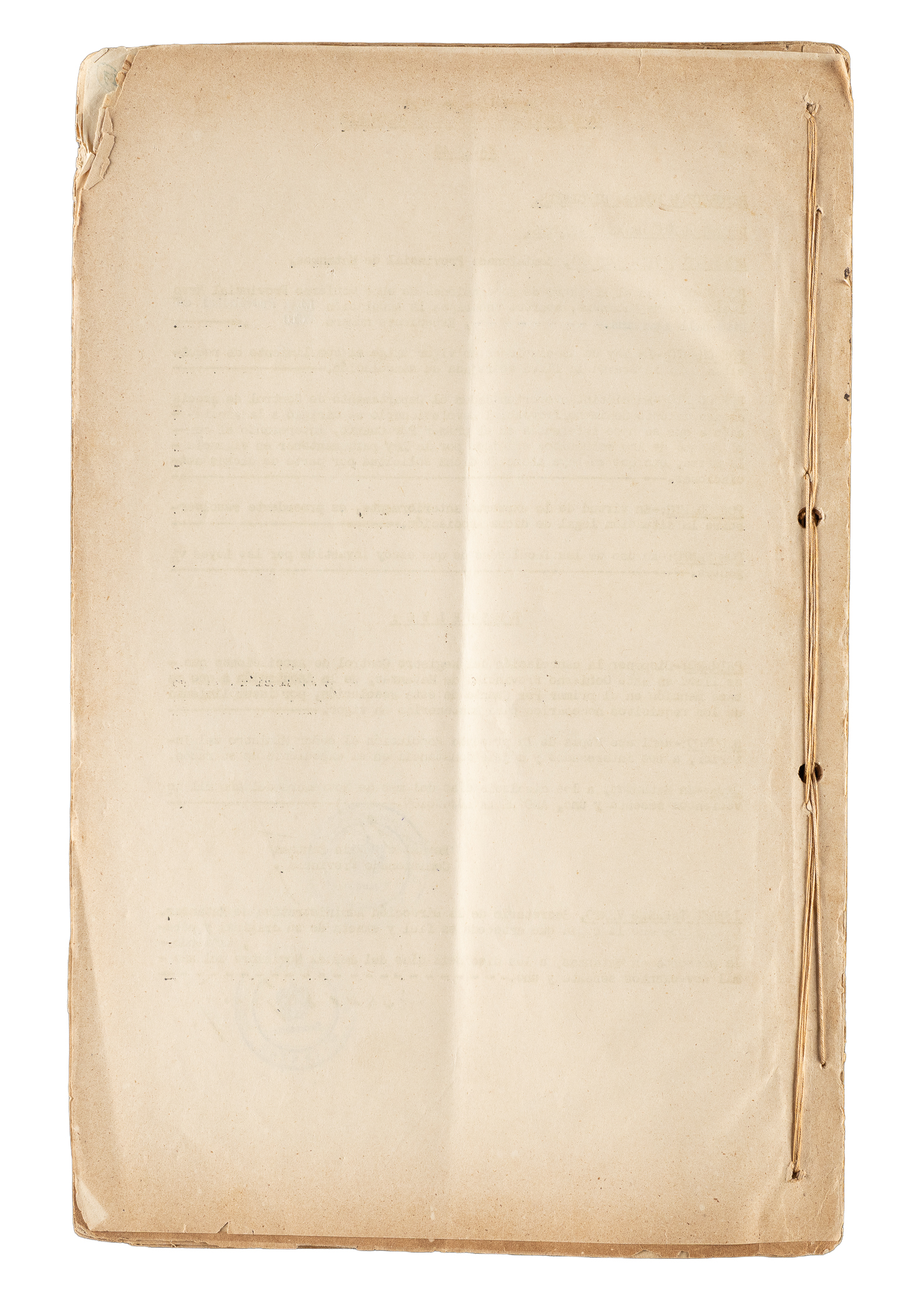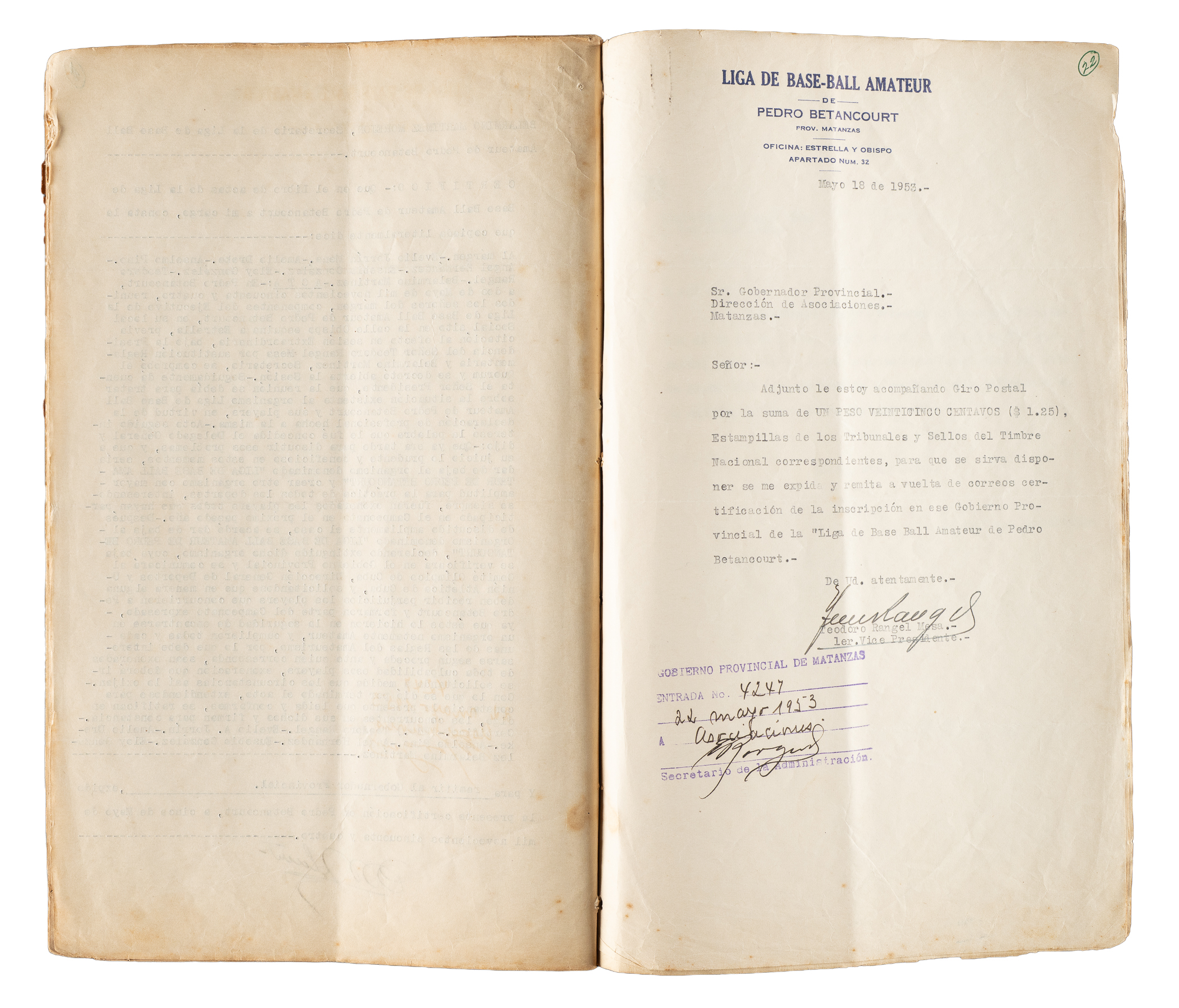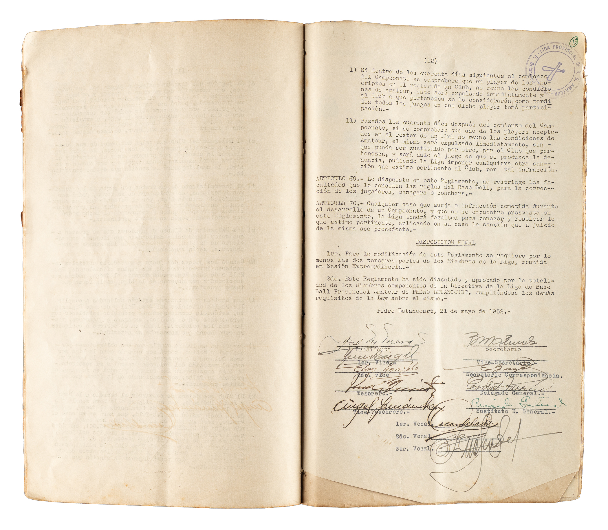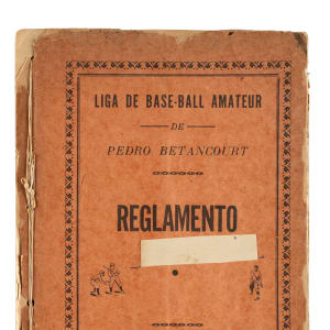 Extremely scarce Cuban baseball rulebook published in 1952 for the Pedro Betancourt Amateur League. Printed in Spanish, this 26-page soft-cover booklet is titled Liga De Base-Ball Amateur / De / Pedro Betancourt / Reglamento / 1952 in black lettering on the cover. Six of the interior pages are signed by league officials. The booklet (8.5 x 13 inches), which is bounded with string, displays a number of obvious flaws to the fragile paper, including several edge tears and chipping. Despite its flaws, the book is intact as issued and remains a historically important relic relating to the early days of Cuban baseball. Auction LOA from James Spence/JSA.
