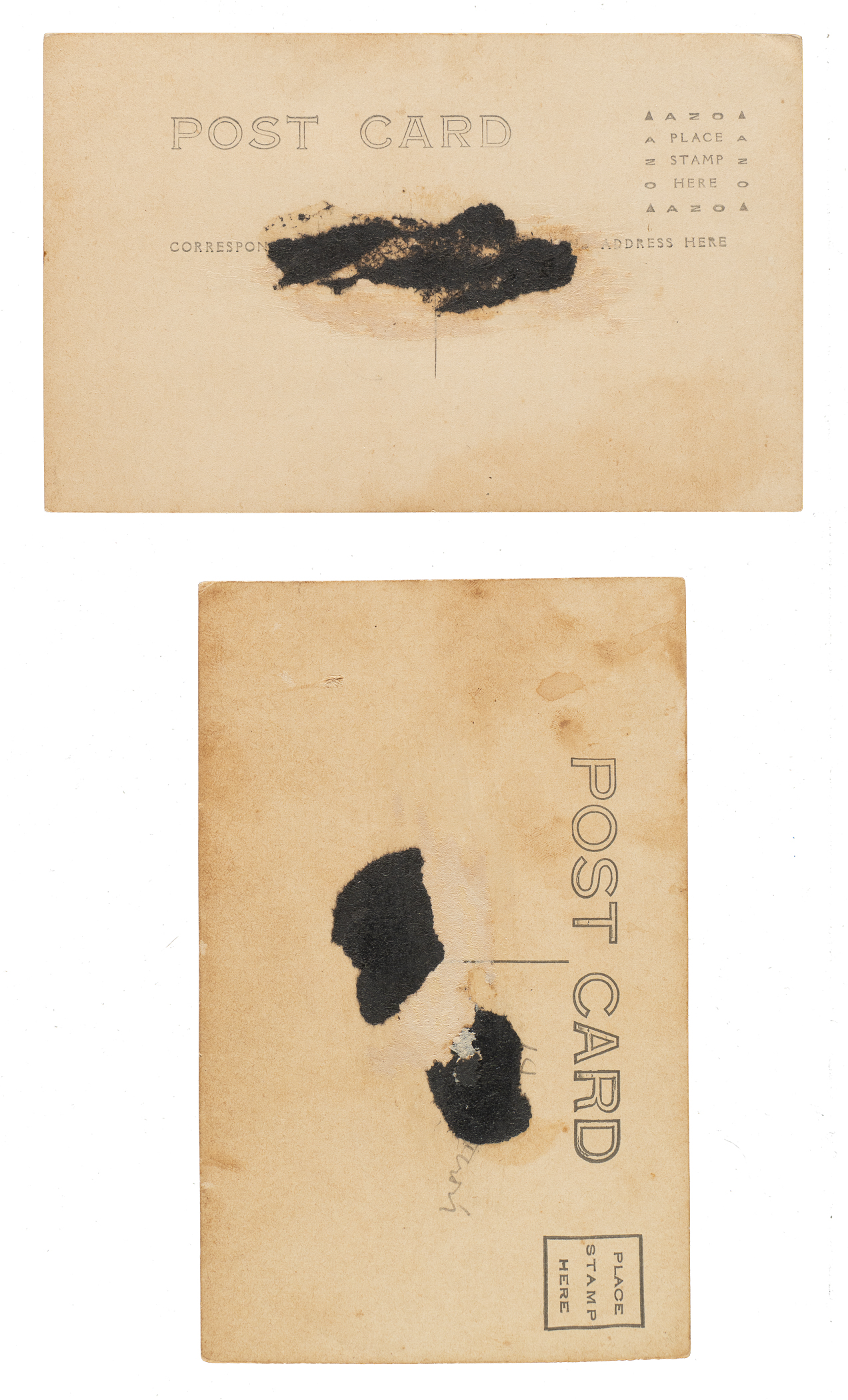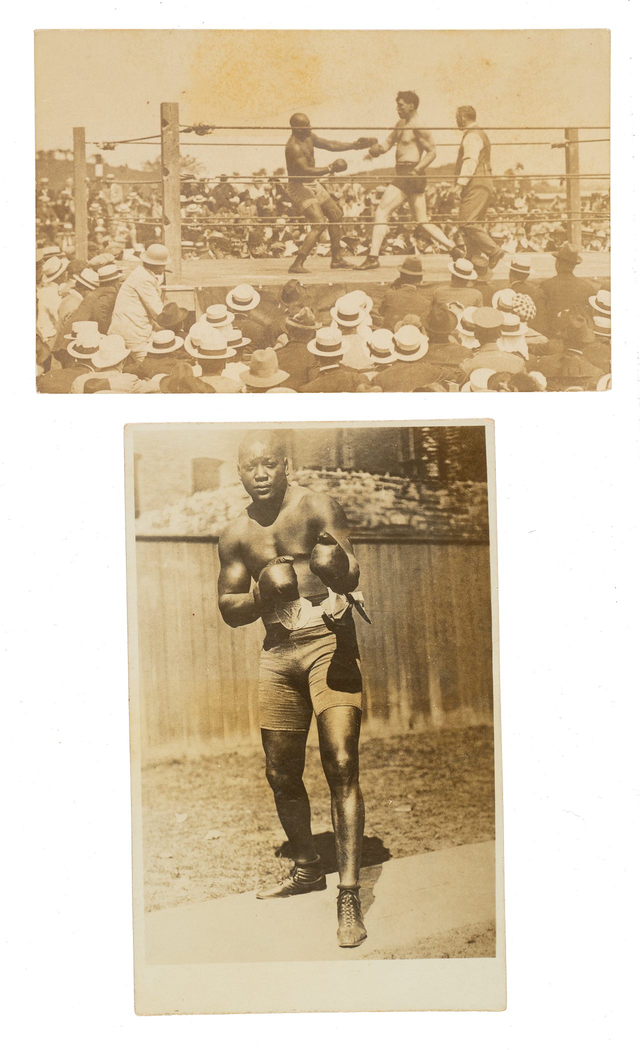 Pair of Jack Johnson real-photo postcards, circa 1910s. This lot consists of the following: Jack Johnson (evidence of album removal on reverse, otherwise Gd) and Johnson/Jess Willard (evidence of album removal on reverse, otherwise Gd). Total: 2 postcards.