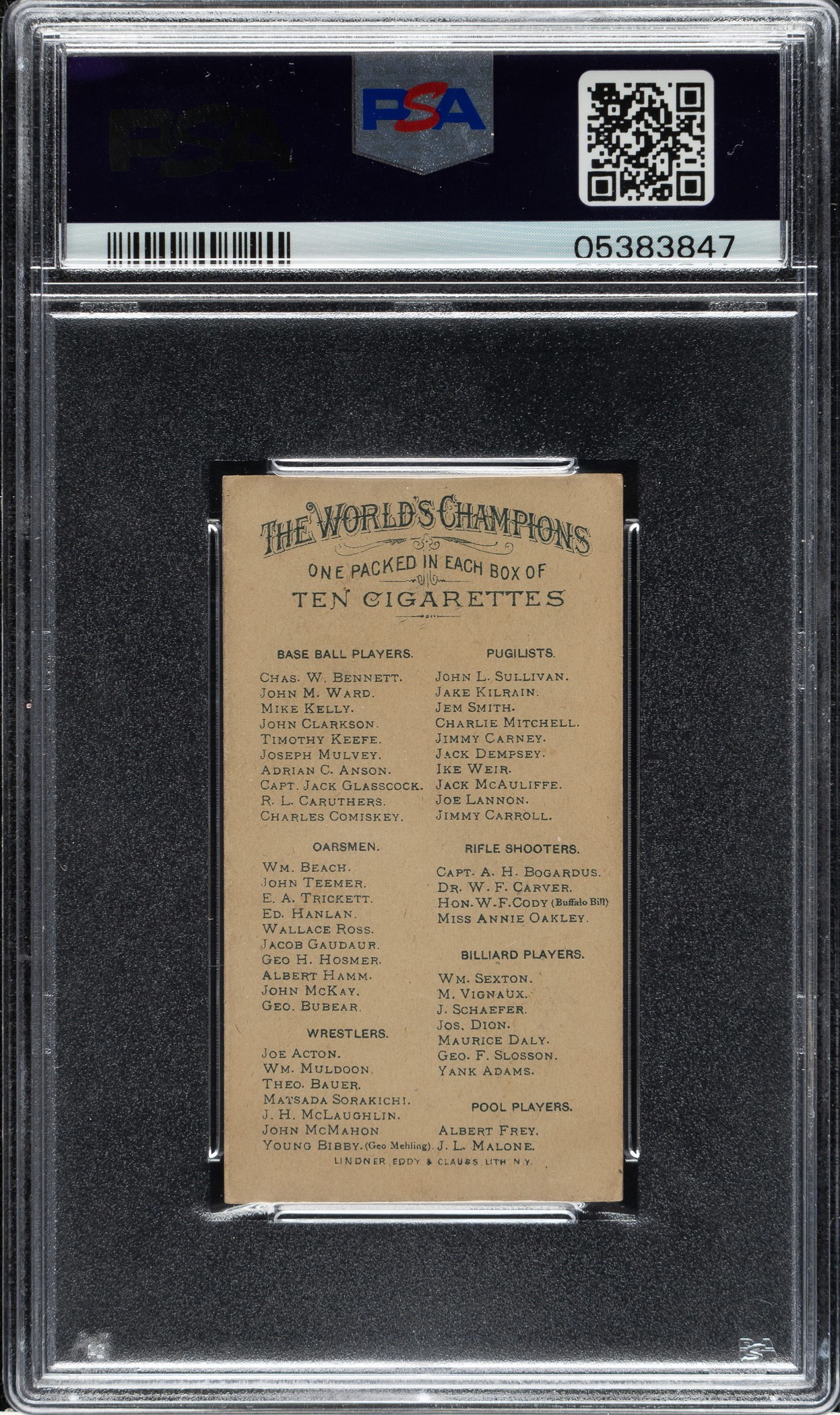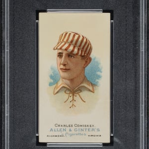 Graded NM 7 by PSA. Beautiful high-grade example of this classic card of Hall of Famer Charles Comiskey issued during his playing days. As first baseman/manager of the St. Louis Browns of the American Association, Comiskey led the Browns to league championships in 1885, 1886, and 1887. Bright, crisp, and clean with a striking portrait image, vibrant colors, and strong corners with light touches of wear. Boldly printed checklist reverse. This is a tremendous high-grade example of one of Charles Comiskey's most popular cards and one of the few dating from his playing days.