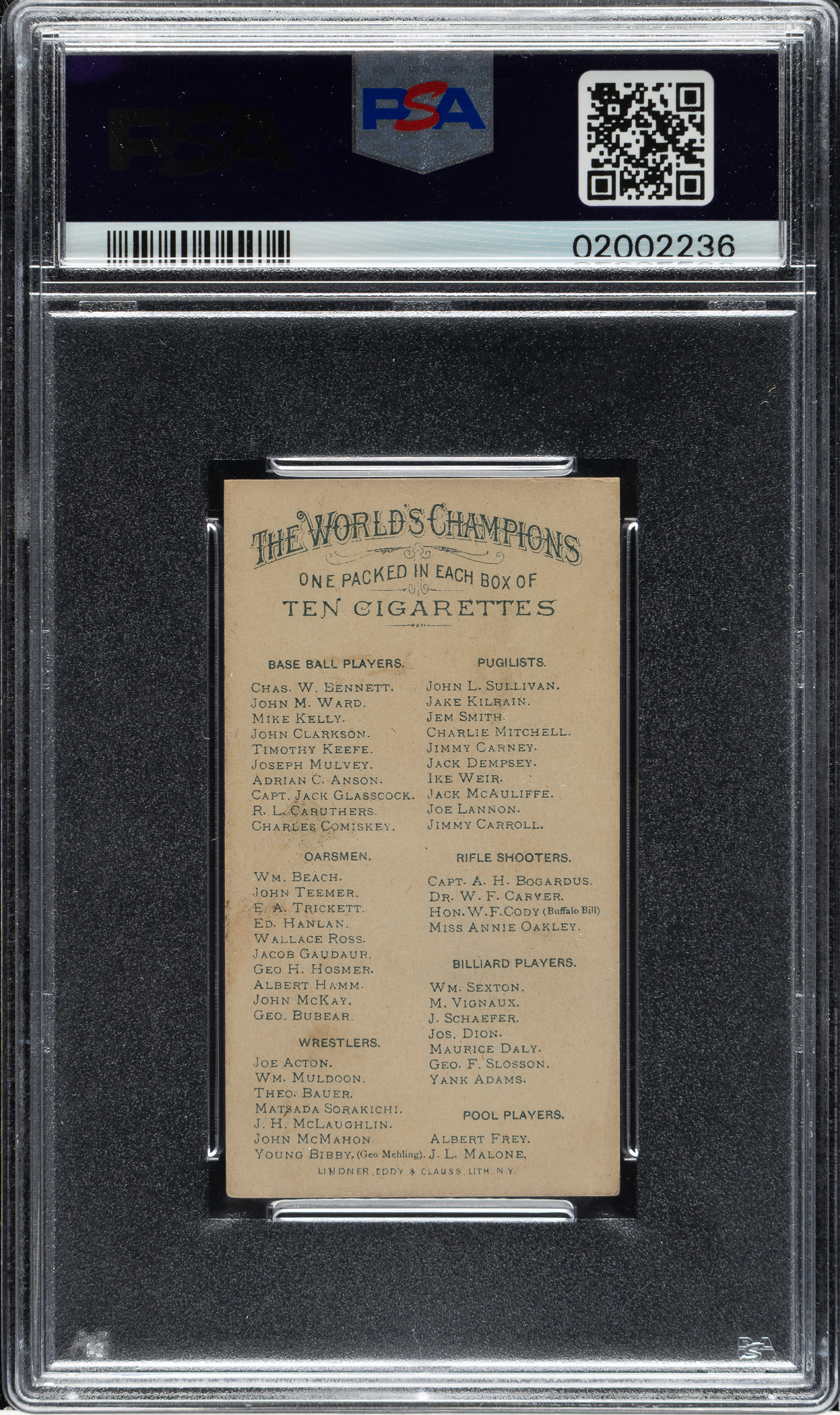 Graded NM 7 by PSA. Exceptionally attractive high-grade example of legendary Hall of Famer John Clarkson from the N28 Allen & Ginter "World's Champions" set. The offered card has brilliant colors, outstanding registration, and strong corners (weaker bottom two). The checklist reverse is mostly clean. The card features Clarkson in a Boston uniform and was issued after he finished the 1887 season with Chicago and signed with Boston for the upcoming season. One of the most classic Hall of Fame cards of the era.
