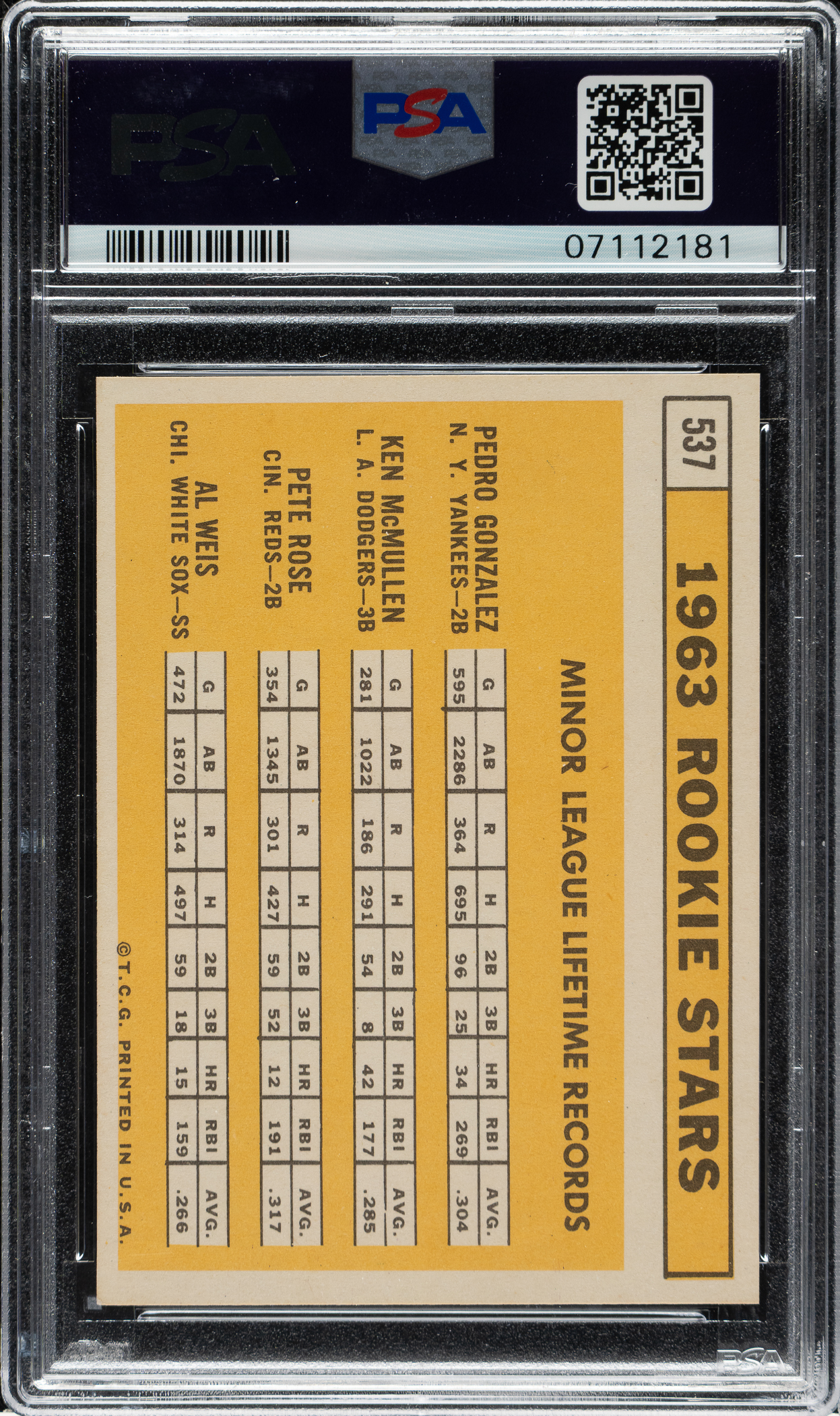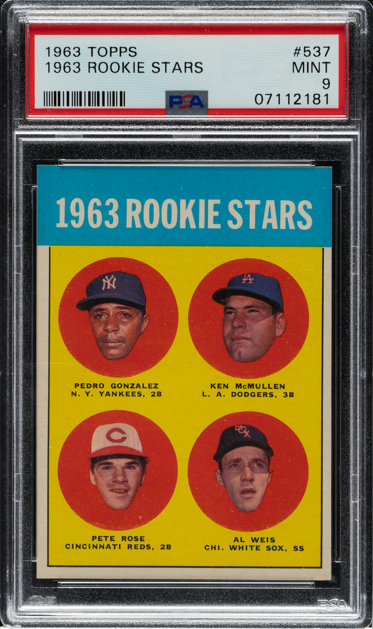 Graded MINT 9 by PSA. Only one example grades higher out of 7,033 cards evaluated to date by PSA. Extraordinary and absolutely stunning ultra-high-grade example of Pete Rose’s rookie card. One of card collecting's greatest classics, Rose's rookie card is the key to the 1963 Topps set and one of the most popular of all postwar baseball cards. This is simply an incredible card and is, without question, one of the finest examples we have ever seen or offered at auction. This example boasts bright and crisp colors, stunning pack-fresh gloss, and four sharp corners. Flawless reverse. A spectacular ultra-high-grade example of this classic card, it is worthy of the finest 1963 Topps or rookie-card collection.