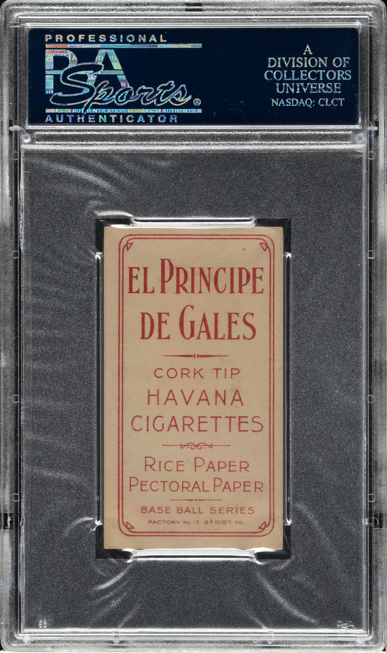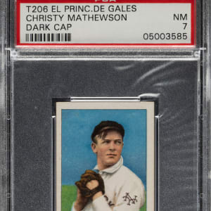Graded NM 7 by PSA. This is the only example of this front/back combination graded at this level by PSA with just one higher. Magnificent high-grade example of one of the three classic poses of Christy Mathewson from the T206 White Borders series. It is further distinguished by its El Principe De Gales advertising back, which is seen far less often than most other T206 advertising backs. The T206 Christy Mathewson dark cap pose is one of the most popular of all T206s, and one of the most highly regarded of all Mathewson cards. This example has a particularly bold image, extremely vibrant colors, and strong corners with light touches of wear. The important advertising reverse is boldly printed. This is an outstanding high-grade example of one of the key Hall of Famers from the legendary T206 set, and it would be at home in any world-class T206, Christy Mathewson, or Hall of Fame collection.