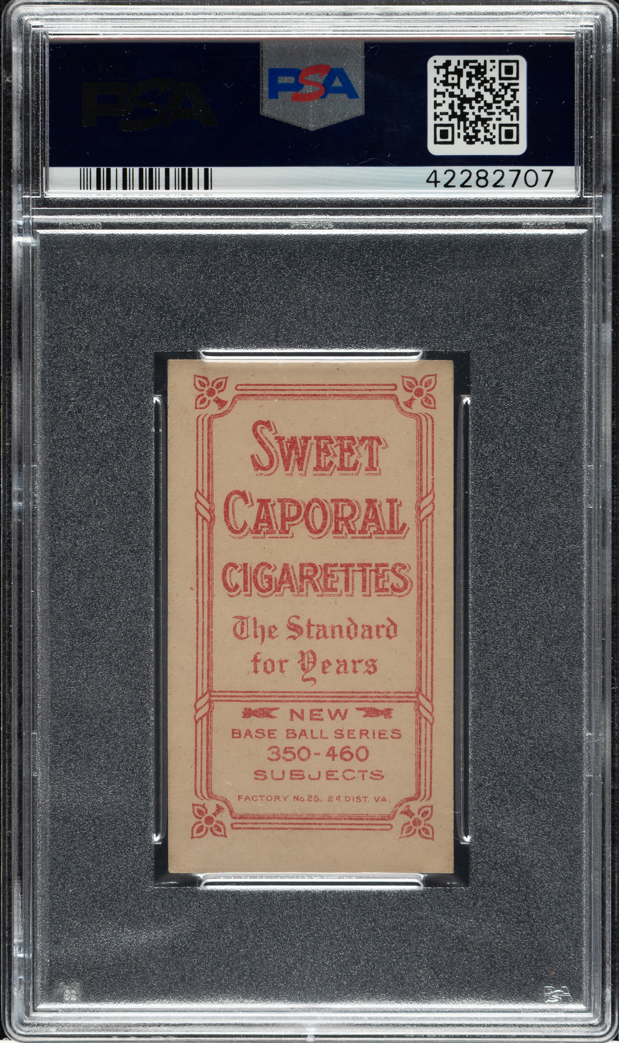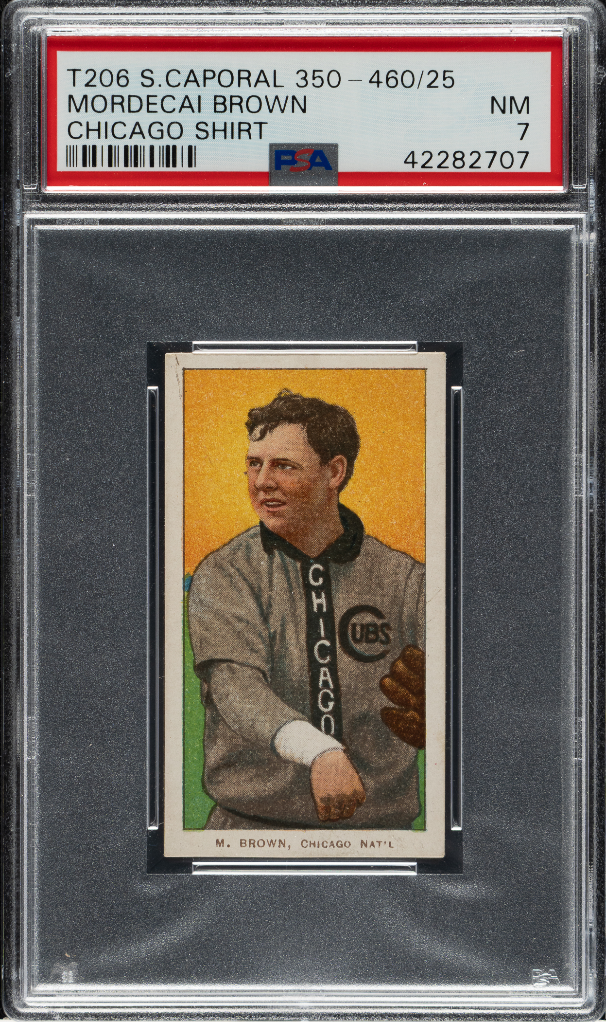 Graded NM 7 by PSA. Superb high-grade example of Hall of Famer Mordecai Brown (Chicago on shirt) from the T206 White Border set. The offered card has beautiful colors, a crisp image, and strong corners with light touches of wear. Boldly printed Sweet Caporal 350-460/25 advertising reverse. An outstanding high-grade card from the legendary T206 set.