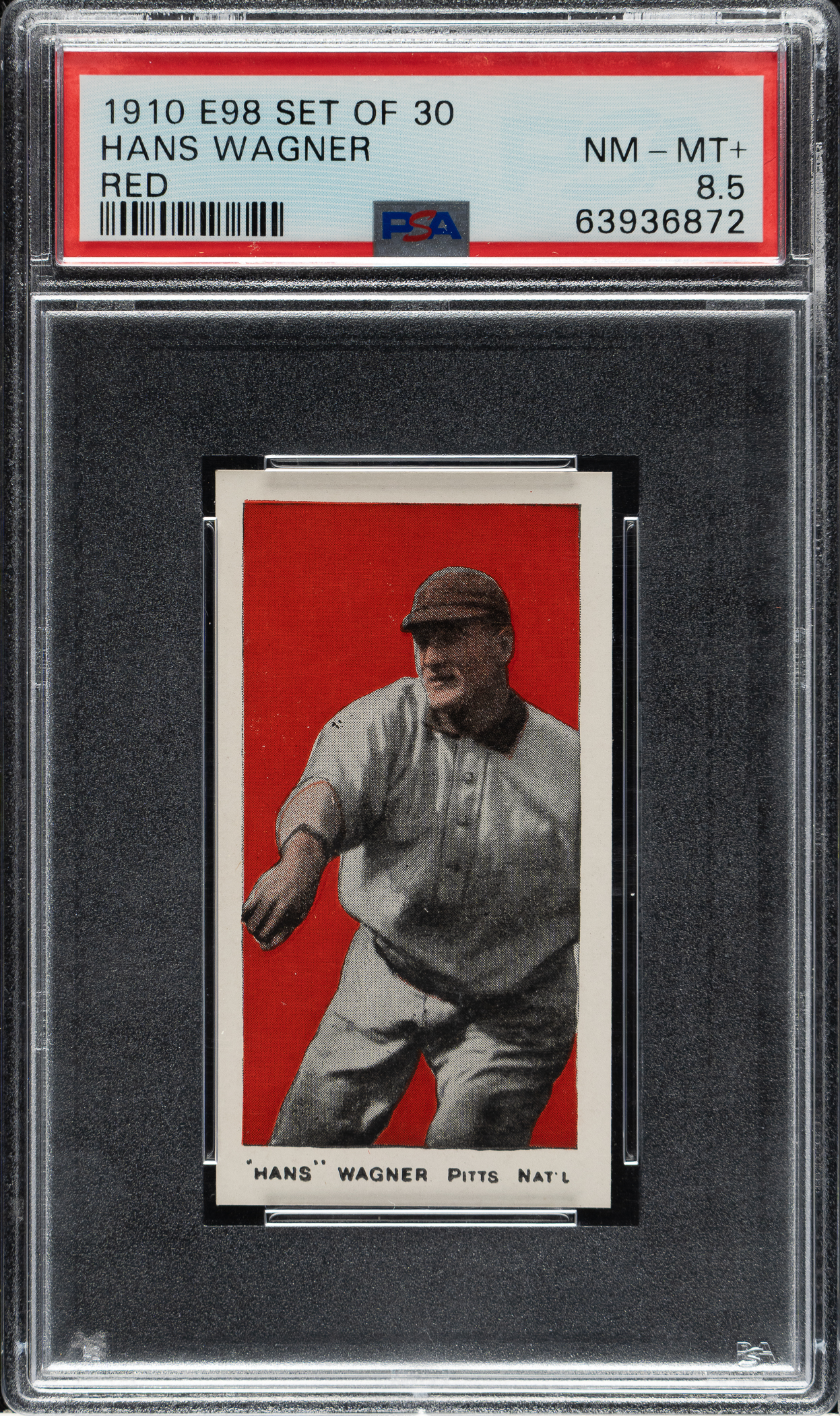 Graded NM-MT+ 8.5 by PSA. Presented is an exceptional high-grade example of legendary Pittsburgh Pirates Hall of Famer Honus Wagner from the E98 “Set of 30” candy-card issue. The manufacturer of E98 is unknown, and the set may be easily confused with other caramel-card sets of the era (E93 and E94 specifically). This is an entirely different set even though it uses many of the same subjects and poses. For many years, E98s were among the scarcest of the 1910-era caramel cards, but the “Black Swamp Find” changed the population dramatically. E98s have always been very desirable, and their increased availability and noteworthiness due to the find may have actually increased the demand as more collectors have become familiar with the set. Set against a vibrant red background, this card offers a crisp image and strong corners. Clean reverse. Caramel cards in general are much rarer than tobacco cards of the era. Because they were issued with caramels one card per package and sold to children (as opposed to being sold to adults with tobacco), they also tend to survive in a much lower grade, making this high-grade card all the more notable. This is a remarkable high-grade example of key Hall of Famer Honus Wagner from this extremely desirable early 20th century candy issue.