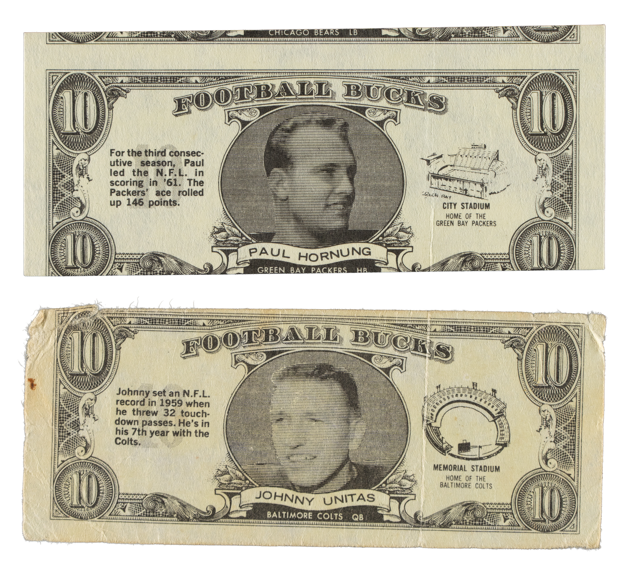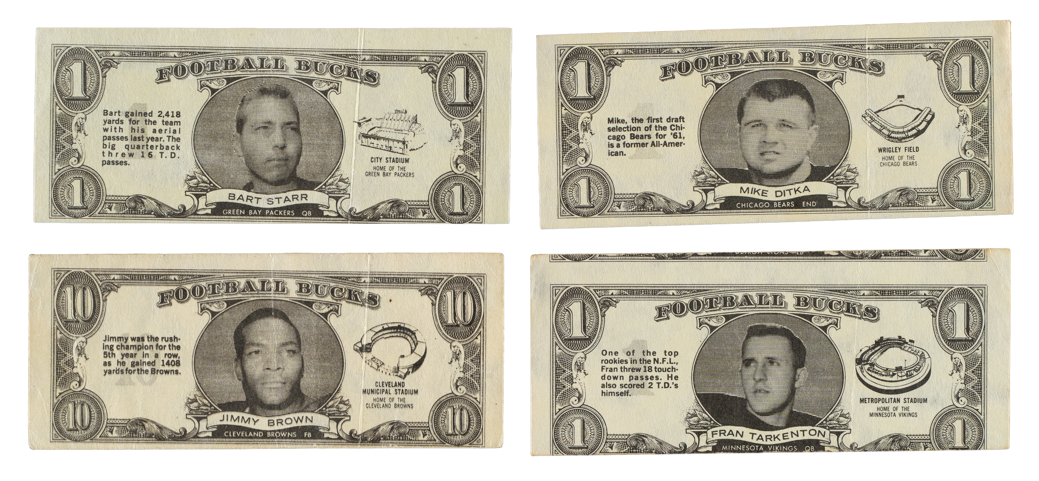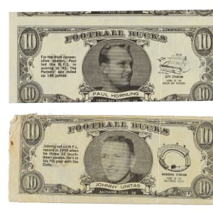 Rarely offered complete set of forty-eight "Football Bucks" issued by Topps in 1962. "Football Bucks" were inserted in packs of 1962 Topps football cards. This extremely unusual set features player portraits on dollar bills measuring approximately 4-1/8 x 1-3/4 inches. A short piece of biographical information is printed to the left of the image, and the player's home stadium is printed to the right. On the reverse are the team and league logos. A fold line is natural to the issue. Condition is 18% Ex or slightly better, 44% Vg to Vg-Ex (including some due solely to centering), and 38% lesser. Keys: #2 Starr (100/0 T/B, otherwise Vg-Ex), 5 Hornung (next card showing, otherwise Nr/Mt), 7 Brown (Fr), 24 Unitas (Pr), 33 Tarkenton (next card showing, otherwise Vg), and 47 Ditka (Vg-Ex+). "Football Bucks" are quite rare. This set has yet to receive the attention it deserves as one of the most unusual, and one of the very few low production run Topps football issues of the early 1960s. Total: 48 cards.