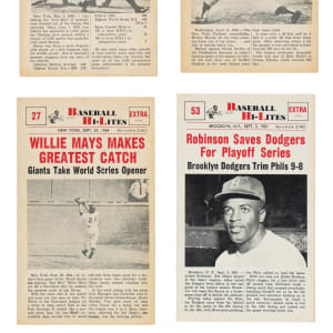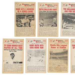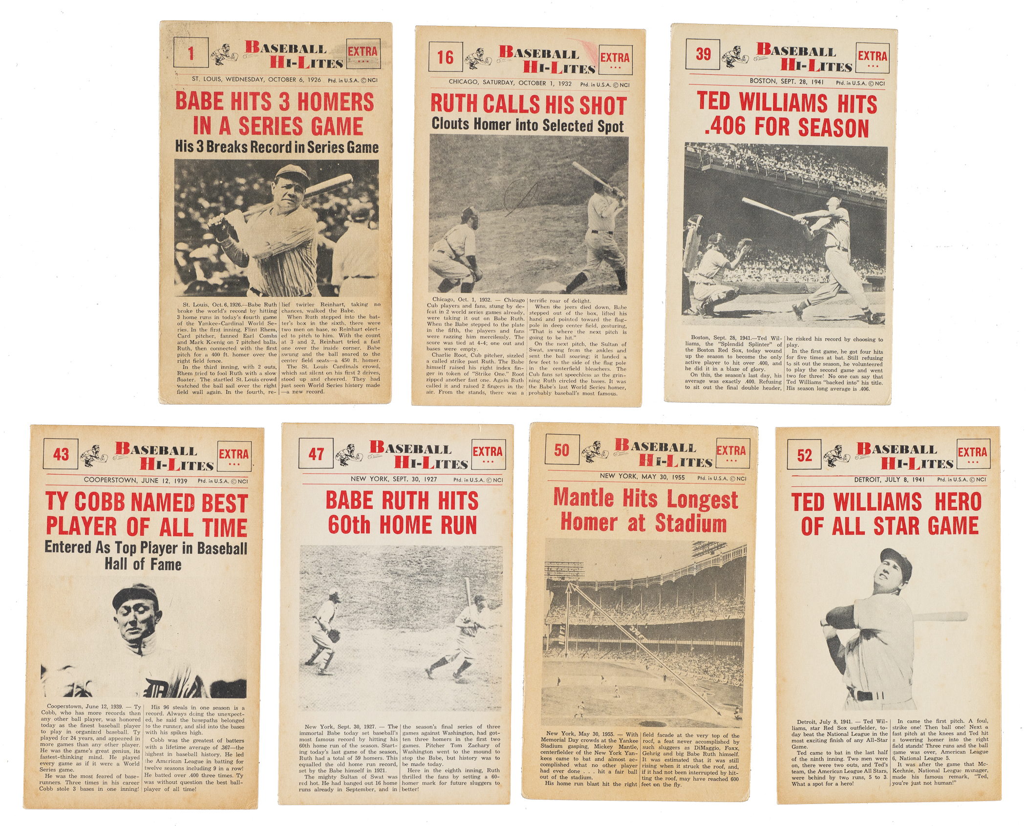 This complete set of seventy-two cards issued by Nu-Card includes many of baseball's greatest moments presented in a mock newspaper design. Included are the following three cards from the similar 1960 Nu-Card CVC Baseball Hi-Lites series: #4 (Vg-Ex), 17 (Vg), and 18 (Vg). Condition is 22% Ex to Ex-Mt, 61% Vg to Vg-Ex, and 17% lesser. Keys: #1 Babe Hits 3 Homers (Pr), 16 Ruth Calls His Shot (Pr), 22 Mickey Mantle Hits Longest HR (Ex), 24 Gehrig Consecutive Game Record Ends (Vg+), 27 Willie Mays Greatest Catch (Vg+), 39 Ted Williams Hits .406 (Vg), 43 Ty Cobb Named Best of All Time (Vg+), 47 Babe Ruth Hits 60th HR (Vg), 50 Mantle Hits Longest HR at Stadium (Gd+), 52 Williams Hero of AS Game (Vg-Ex), and 53 Robinson Saves Dodgers (Vg-Ex+). Very attractive complete set of 1960 Nu-Card Baseball Hi-Lites loaded with Hall of Famers and stars. Total: 75 cards.