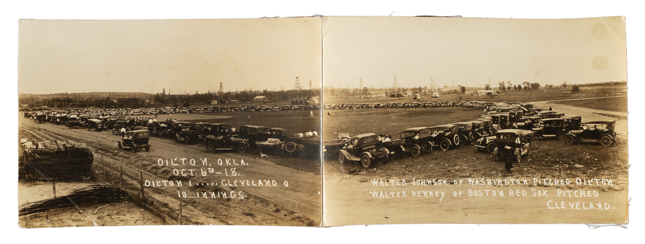 Rare panoramic photograph capturing a game-in-progress scene taken in Oilton, Oklahoma, on October 6th, 1918. This postseason exhibition game was between Oilton and Cleveland. The highlight of the game was the fact that Washington Senators future Hall of Famer Walter Johnson pitched for the local Oilton team, while fellow Major Leaguer Walt Kinney of the Boston Red Sox pitched for Cleveland. The text along the base reads "Oilton, Okla./Oct. 6th - 18./Oilton 1....Cleveland 0/10 innings - Walter Johnson of Washington Pitched Oilton/ Walter Kenney of Boston Pitched Cleveland." This is the first example of this panoramic image we have ever offered! The photo (13 x 4.5 inches), which is actually two separate smaller photos joined together in the center, is linen-backed and displays a crystal-clear image and moderate creases. Despite being linen-backed, the photo is in Fair condition overall.