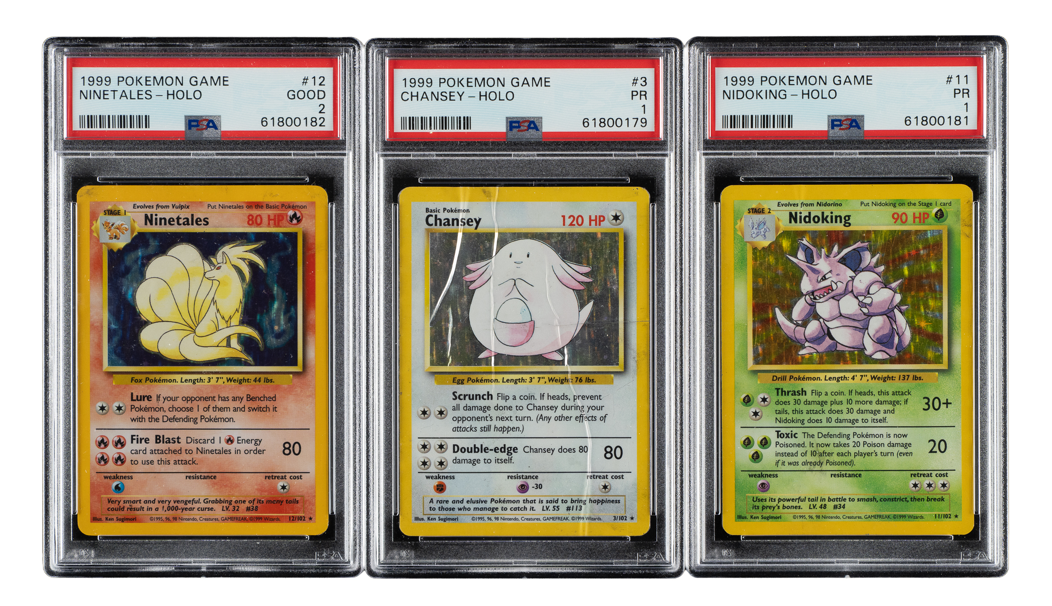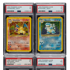 Collection of seven 1999 Pokemon Base Set Holographic cards, each graded and encapsulated by PSA. This collection consists of the following: 1) #2 Blastoise Holographic (EX 5). 2) #3 Chansey Holographic (POOR 1). 3) #4 Charizard Holographic (POOR 1). 4) #7 Hitmonchan Holographic (NM 7). 5) #8 Machamp 1st Edition Holographic (EX 5). 6) #11 Nidoking Holographic (POOR 1). 7) #12 Ninetales Holographic (GOOD 2). Total 7 cards.