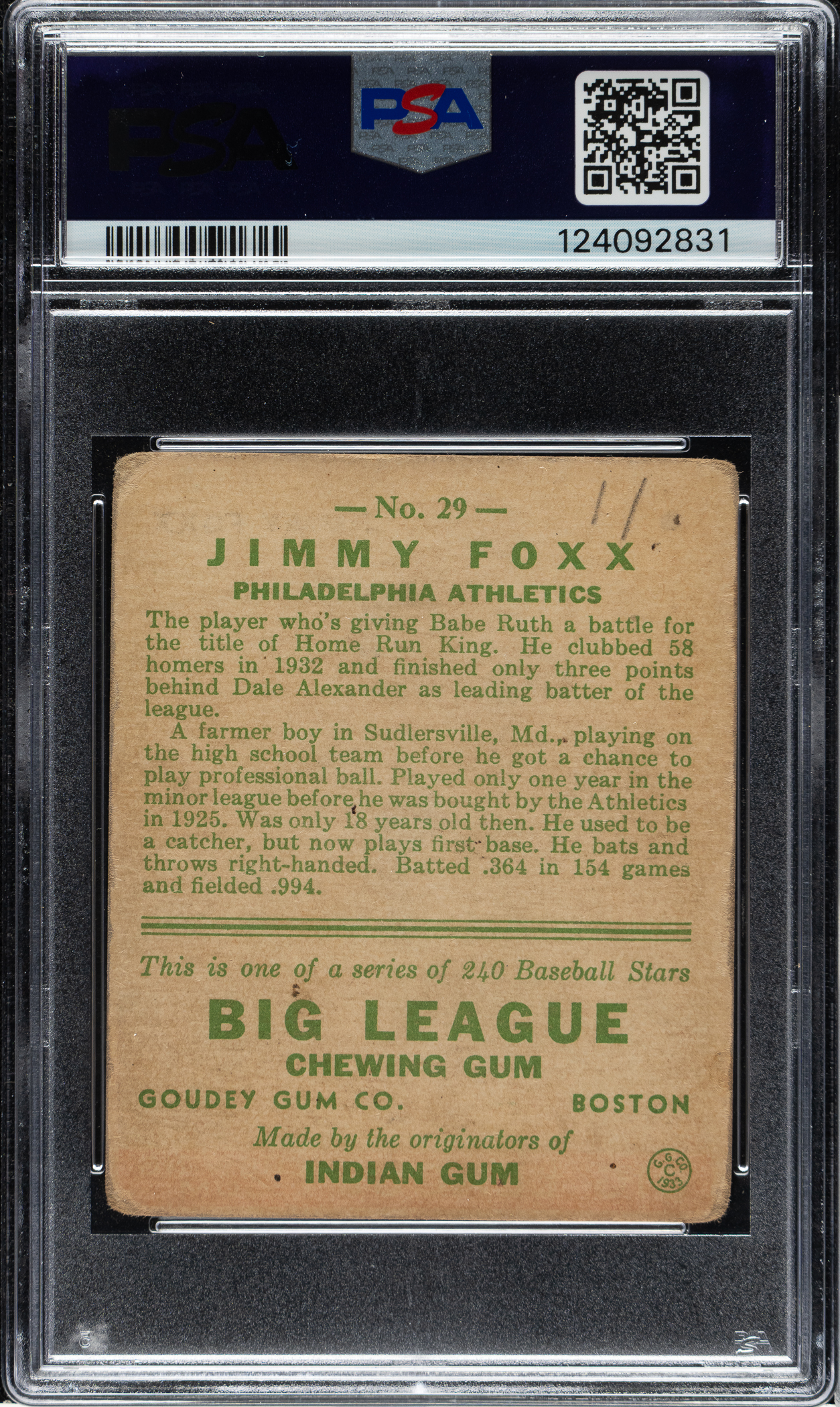 Graded FAIR 1.5 (MK) by PSA. Philadelphia Athletics Hall of Famer Jimmie Foxx.