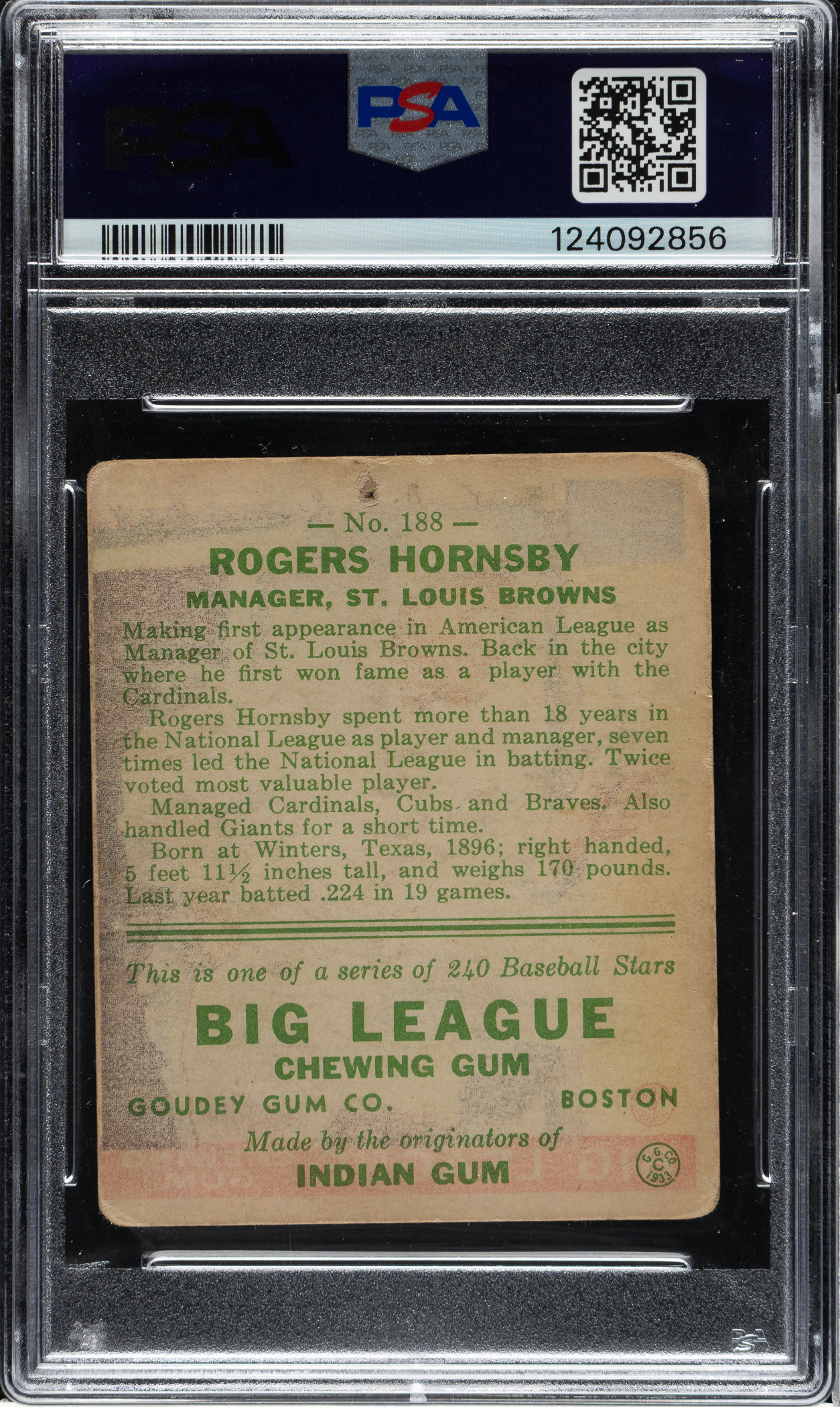 Graded POOR 1 by PSA. St. Louis Browns Hall of Famer Rogers Hornsby.