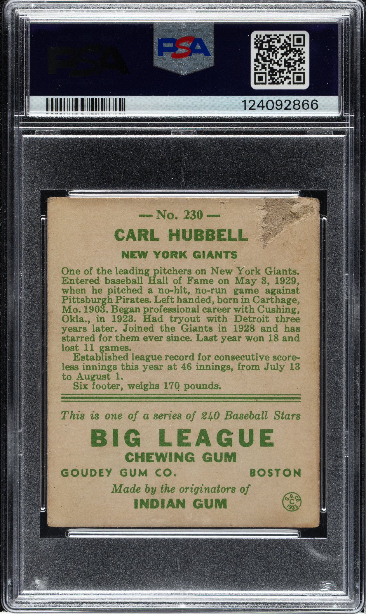 Graded POOR 1 by PSA. New York Giants Hall of Famer Carl Hubbell.