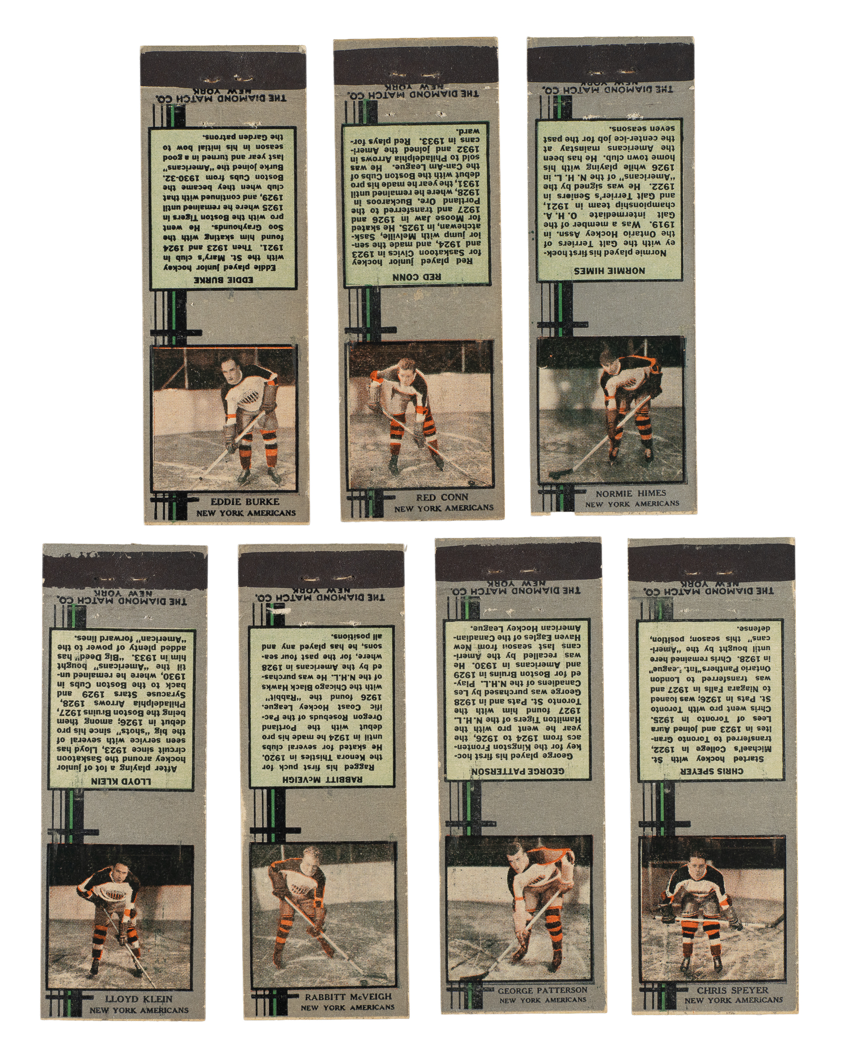 Collection of seven 1933-1934 Diamond Matchbooks Hockey Silver cards. Condition is Vg to Vg-Ex overall. This collection consists of the following: Burke, Conn, Himes, Klein, McVeigh, Patterson, and Speyer. Total: 7 cards.