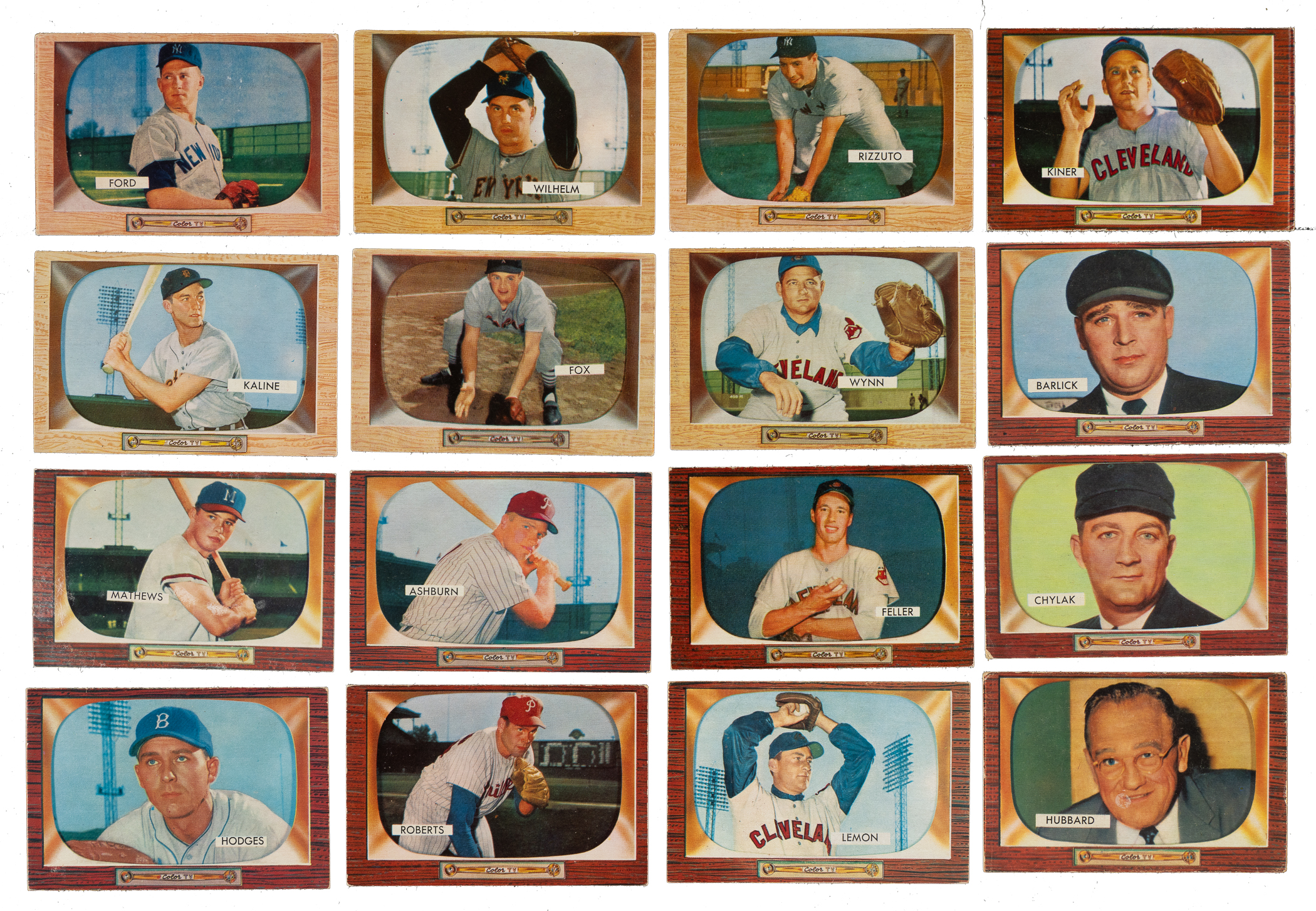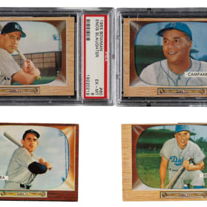 Presented is a near-complete master set of 1955 Bowman baseball consisting of 320 different cards (out of 326), including five of the six variations in the set. Missing the following six cards for completion of a master set: #48a Milt Bolling/Frank Bolling back, 179 Aaron, 184 Mays, 202 Mantle, 206, and 242 Banks. Includes one duplicate (#48b). Condition is 35% Ex to Ex-Mt (including a couple Nr/Mt), 58% Vg to Vg-Ex, and 7% lesser (including a few that measure small and a few with color added). Eleven cards have been professionally graded and encapsulated by PSA. Keys: #1 Wilhelm (Vg+), 10 Rizzuto (Vg), 22 Campanella (EX-MT+ 6.5), 23 Kaline (Vg+), 33 Fox (Vg-Ex), 37 Reese (Vg), 38 Wynn (Vg), 59 Ford (Gd), 60 Slaughter (EX-MT 6), 68 Howard RC (EX-MT 6), 103 Mathews (Fr), 130 Ashburn (Vg-Ex+), 134 Feller (Vg-Ex+), 143 Newcombe (VG-EX 4), 158 Hodges (Vg-Ex+), 168 Berra (Vg+), 171 Roberts (Vg-Ex), 191 Lemon (Vg-Ex), 195b Palica/traded line (EX+ 5.5), 197 Kiner (Vg), 265 Barlick (Vg-Ex), 272 (EX 5), 275 (EX-MT 6 [MC]), 283 Chylak (Vg), 296 (EX-MT 6 [MC]), 303 Conlan (VG 3), 306 (VG-EX 4), 311 (VG 3), and 315 Hubbard RC (Gd+). The 1955 Bowman cards (Bowman's final baseball-card issue) have always been very popular due to their classic "television" style and inclusion of so many stars. The flush-to-the-border wood-grain design of this issue makes them very susceptible to corner and edge wear and very difficult to assemble as a complete set in high grade. Overall a very sharp-looking near-complete master set, with only a few problem cards. This is the type of vintage set that, to so many collectors, represents the very best value. Total: 321 cards.