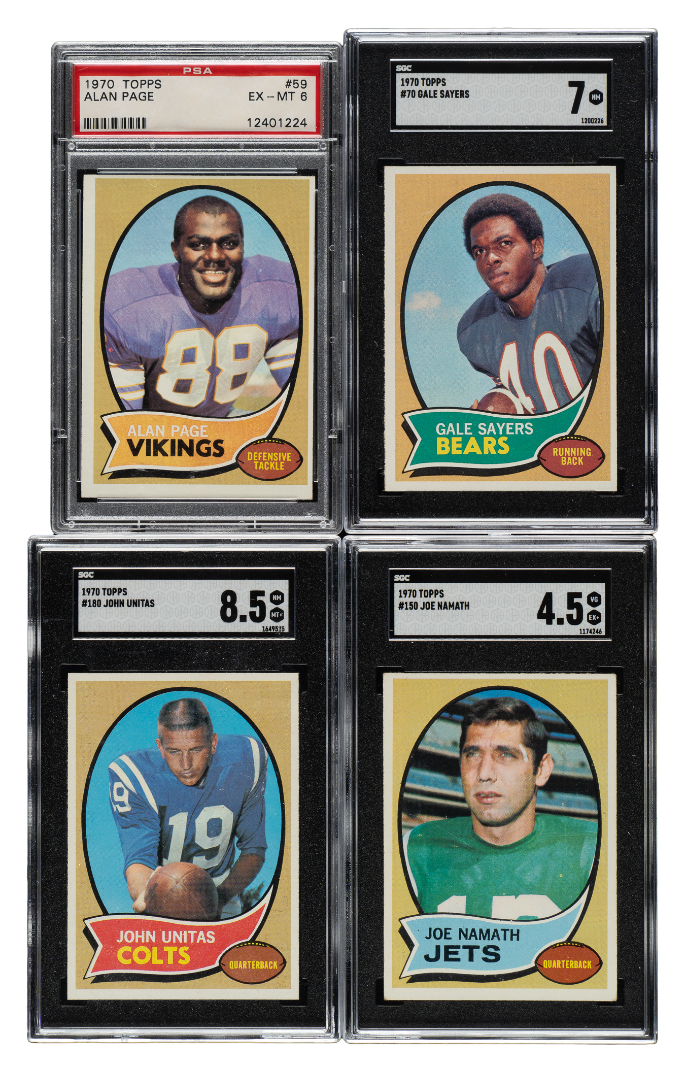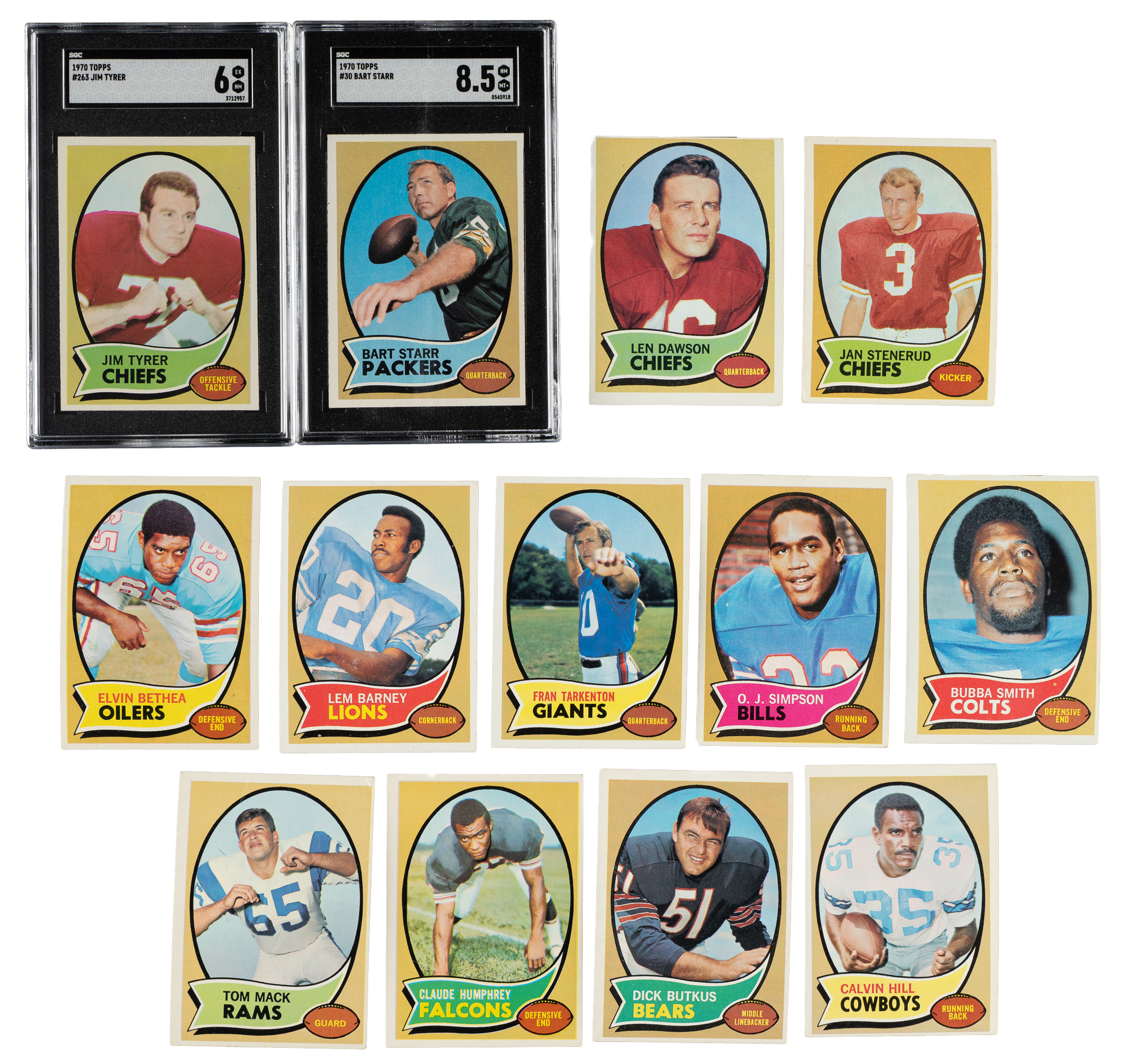 Presented is a complete 263-card set of 1970 Topps football cards, highlighted by an O.J. Simpson rookie card and SGC NM/MT+ 8.5 examples of Bart Starr and Johnny Unitas. Includes two duplicates (#116 Otto and 262). The condition is 17% Ex-Mt to Nr/Mt (including two better), 62% Vg-Ex to Ex, and 21% Gd to Vg (including one lesser and a couple with a slight miscut). Six cards have been professionally graded and encapsulated by SGC (5) and PSA (1). Keys: #1 Dawson (10/90 T/B, otherwise Vg-Ex+), 25 Stenerud RC (Vg+), 30 Starr (NM/MT+ 8.5), 43 Bethea RC (Ex), 59 Page RC (PSA EX-MT 6), 70 Sayers (NM 7), 75 Barney RC (Vg-Ex), 80 Tarkenton (Ex), 90 Simpson RC (Fr due to foreign substance on top border), 114 Smith RC (Vg-Ex+), 150 Namath (VG/EX+ 4.5), 151 Mack RC (Vg), 156 Humphrey RC (Ex-Mt), 180 Unitas (NM/MT+ 8.5), 190 Butkus (Vg-Ex), 260 Hill RC/name in red (Vg-Ex), and 263 (EX/NM 6). This is a very attractive complete Topps Football set with many highlights. Total: 265 cards (set of 263 plus two duplicates).