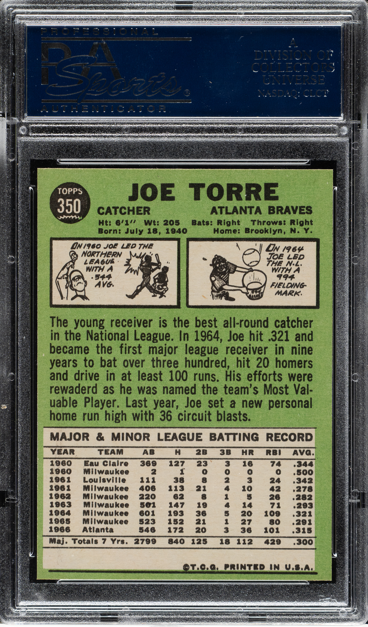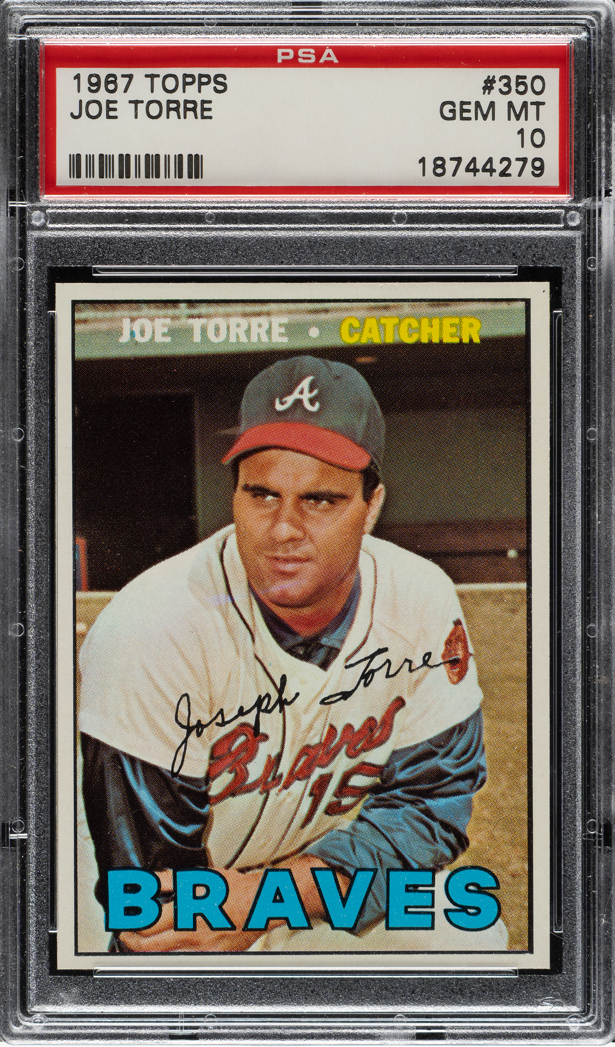 Graded GEM MINT 10 by PSA. Atlanta Braves Hall of Famer Joe Torre. One of only four examples graded at this superior level by PSA to date.