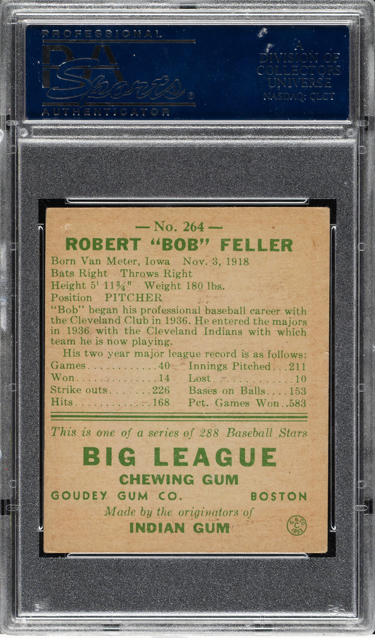 Graded VG-EX+ 4.5 by PSA. Exceptional mid-grade example of Cleveland Indians Hall of Fame pitcher Bob Feller from the extremely popular 1938 Goudey “Heads-Up” issue. This card is extremely significant both as one of the key stars in the 1938 Goudey set and also as one of the most sought after of all Bob Feller cards. The card displays bold colors, outstanding registration, even corner wear, and impressive centering. Boldly printed reverse displaying a light crease near the upper-left corner. This is a very attractive mid-grade Hall of Famer example from one of the 1930s' most classic sets.