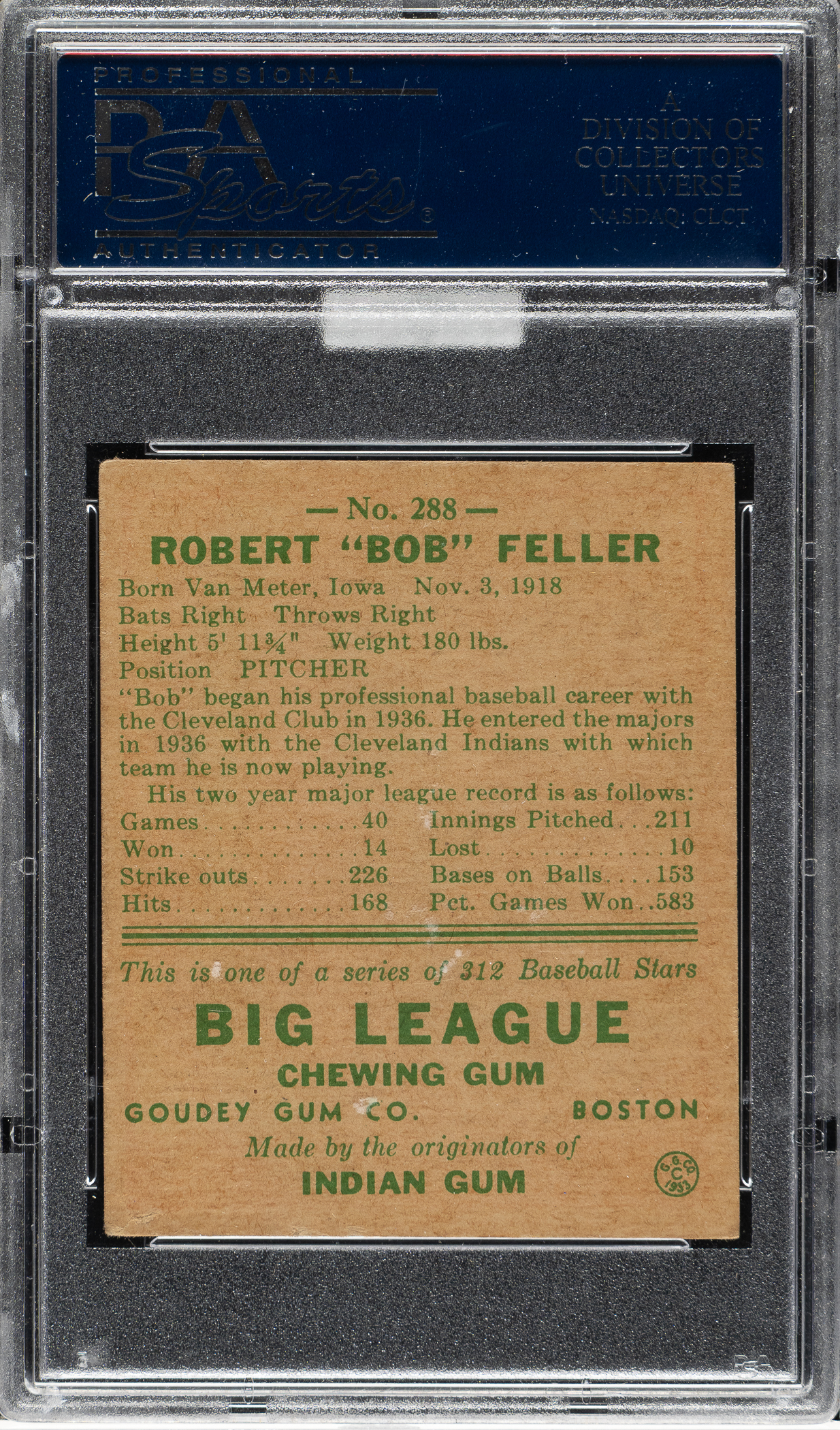 Graded VG-EX 4 by PSA. Mid-grade example of Cleveland Indians Hall of Fame pitcher Bob Feller from the extremely popular 1938 Goudey “Heads-Up” issue. This card is extremely significant, both as one of the key stars in the 1938 Goudey set and also as one of the most sought after of all Bob Feller cards. The card displays bold colors, outstanding registration, honest corner wear, and light toning front and back. Boldly printed reverse. This is an attractive mid-grade Hall of Famer example from one of the 1930s' most classic sets. Awarded an MBA Silver Diamond by Mike Baker Authenticated for high-end eye appeal. A corresponding MBA sticker is affixed to the front of the holder.