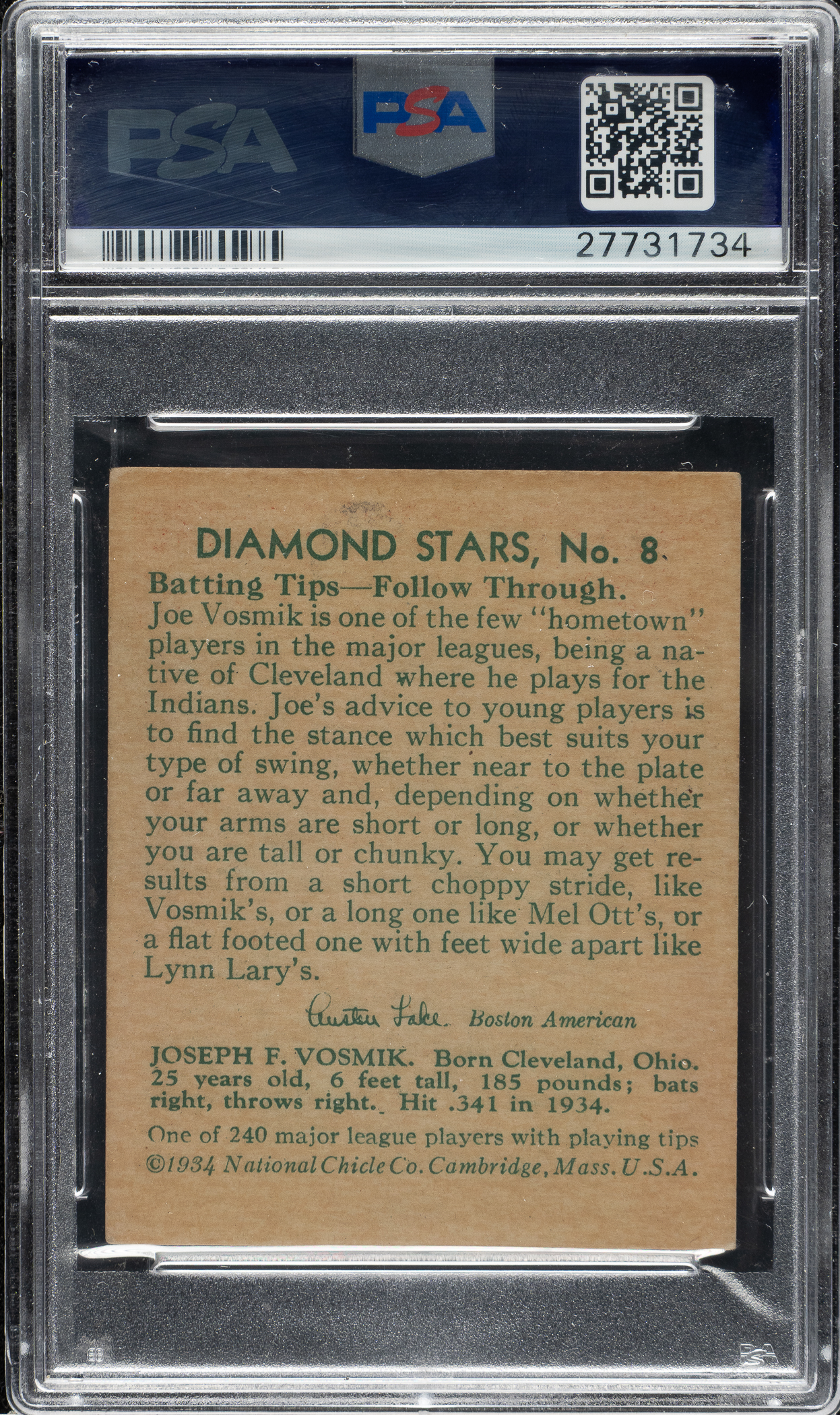 Lot # 1592: 1934-1936 R327 Diamond Stars #8 Joe Vosmik (1935 Green Back) PSA VG-EX+ 4.5