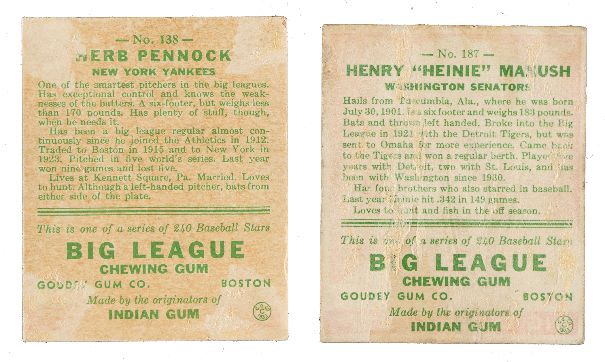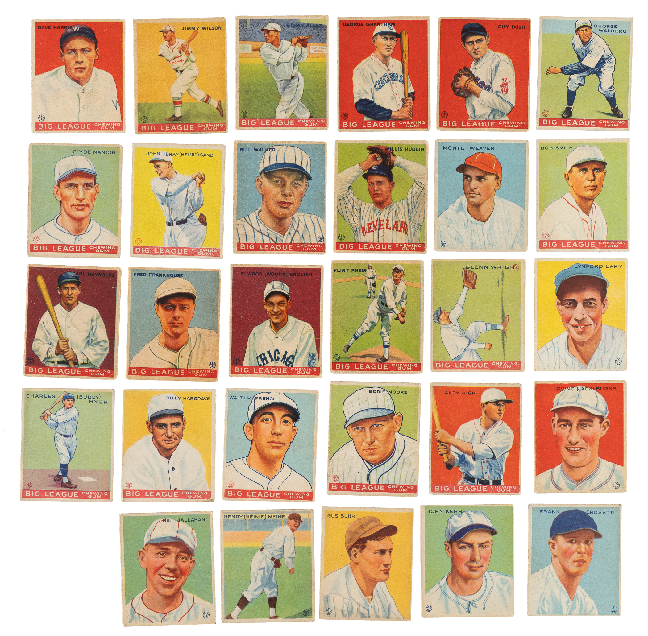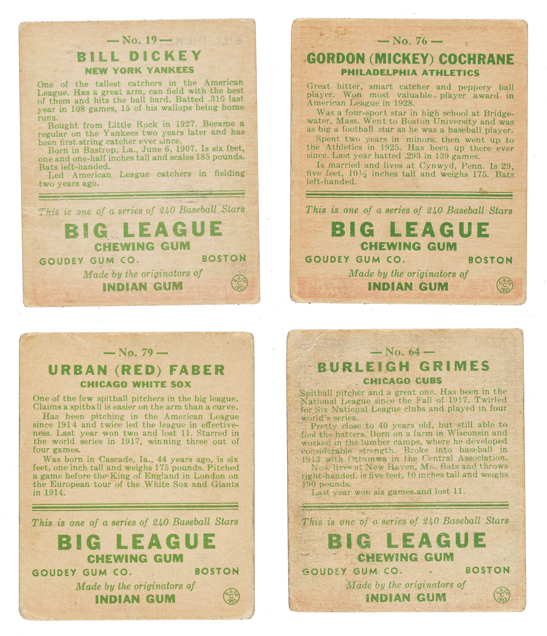 Presented is a collection of 35 different 1933 R319 Goudey baseball cards highlighted by six Hall of Famers, including Bill Dickey and Mickey Cochrane. Condition is 65% Gd to Vg (including three Vg-Ex) and 35% Pr to Fr (including one that measures narrow). This collection consists of the following: #9, 19 Dickey (Fr, HOF), 37, 46, 64 Grimes (Pr-Fr, HOF), 66, 67, 76 Cochrane (Vg, HOF), 79 Faber (Gd, HOF), 80, 85, 94, 96, 111, 120, 131, 135, 136, 138 Pennock (Pr-Fr due solely to back damage, HOF), 143, 153, 172, 177, 180, 182, 183, 185, 187 Manush (Pr), 193, 198, 200, 205, 206, 214, and 217. This is an attractive medium- to lower-grade collection of cards from this classic 1930s gum-card set. Total: 35 cards.