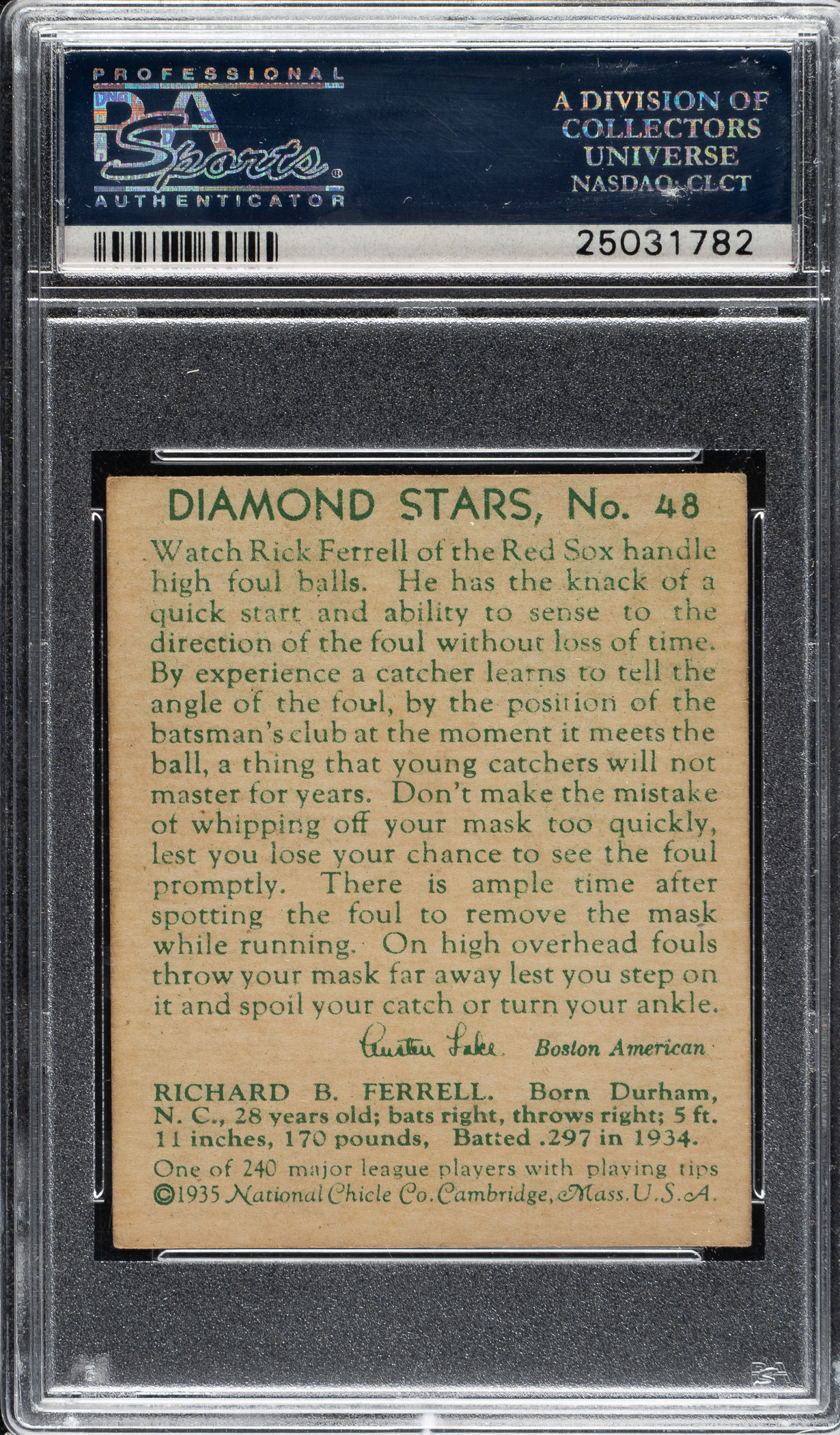 Graded EX 5 by PSA. Boston Red Sox Hall of Famer Rick Ferrell.