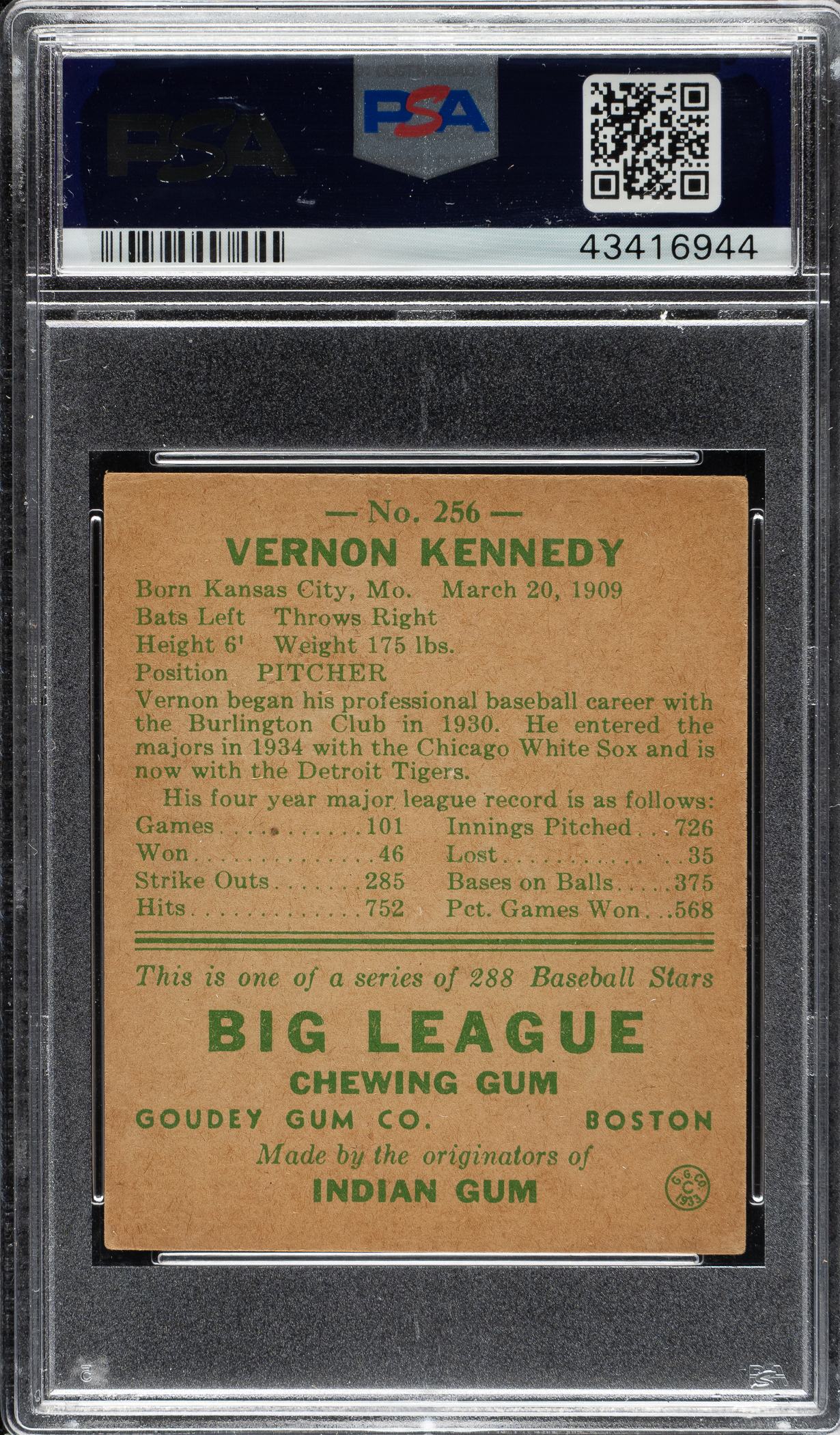 Lot # 1637: 1938 R323 Goudey "Heads-Up" #256 Vernon Kennedy PSA VG-EX 4