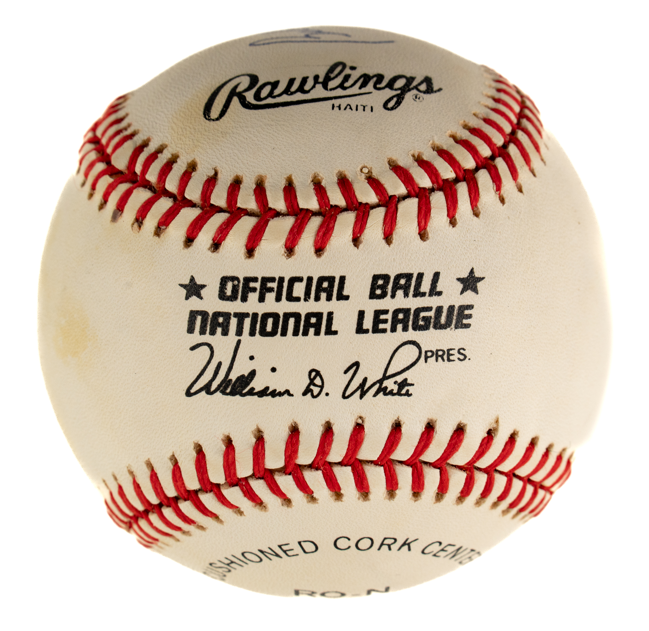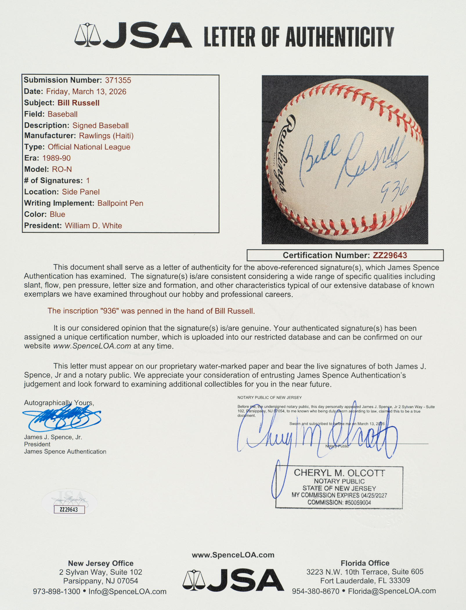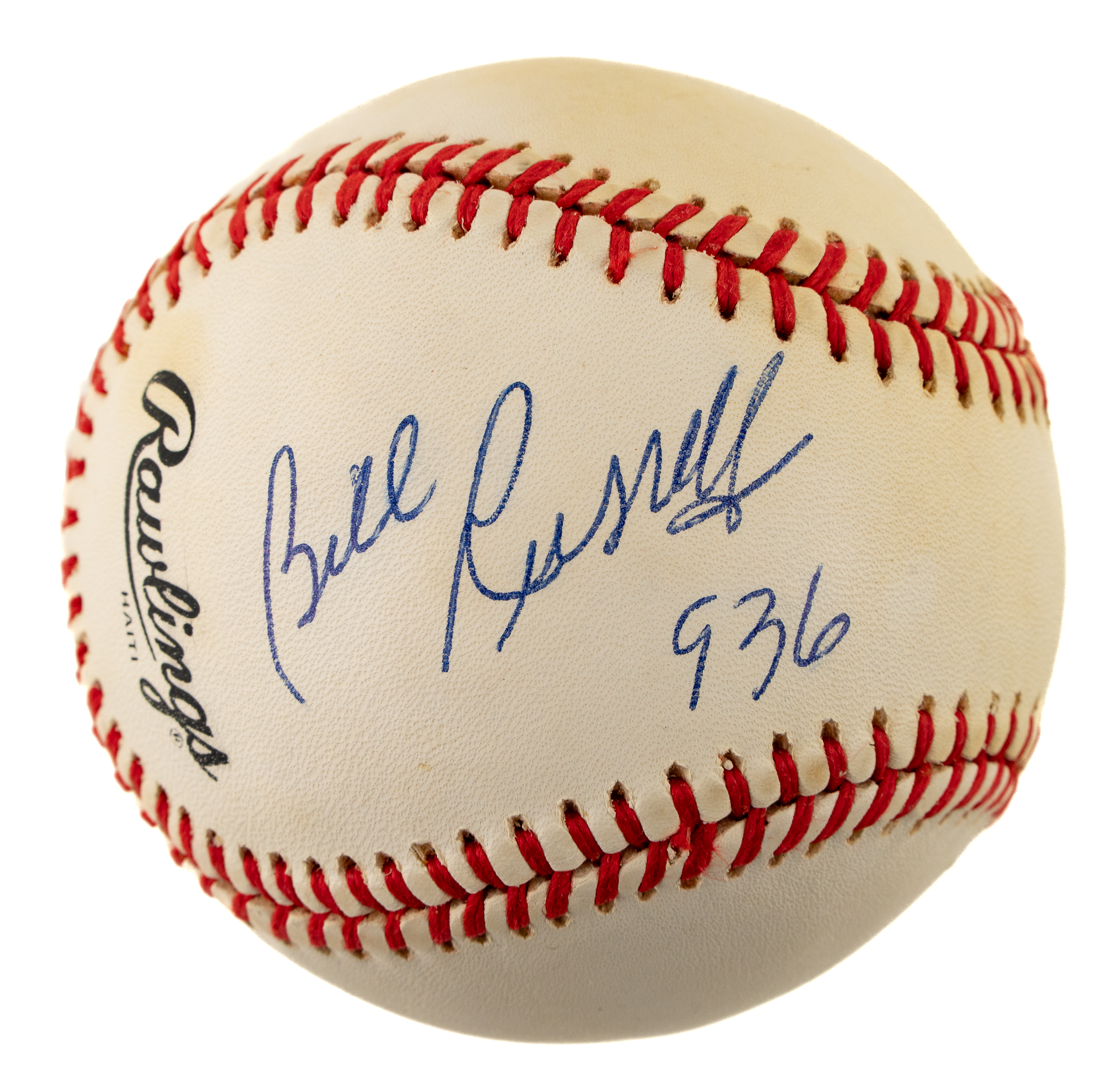 Official National League baseball (White) signed by basketball Hall of Famer Bill Russell in blue ink on a side panel. Russell has added the inscription "936" below his signature. Near Mint condition overall. Full LOA from James Spence/JSA.