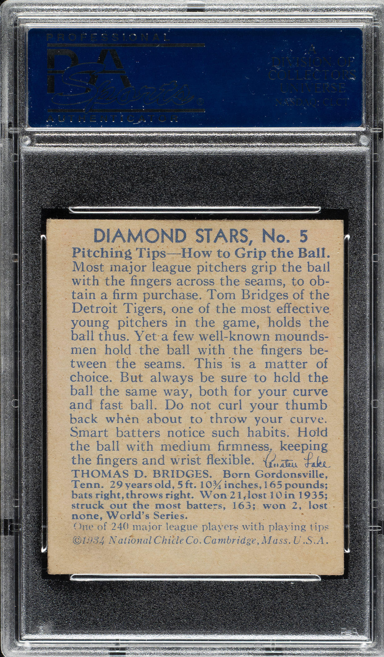 Lot # 1577: 1934-1936 R327 Diamond Stars #5 Tom Bridges (1936 Blue Back) PSA EX 5