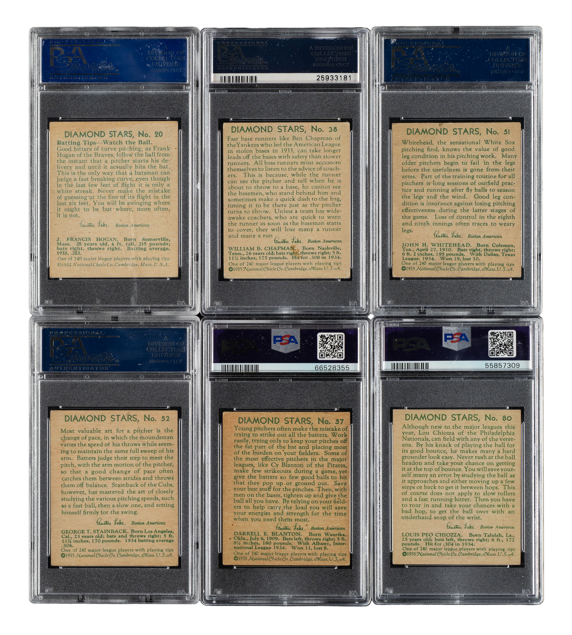 Collection of six 1934-1936 R327 Diamond Stars cards, each graded and encapsulated VG-EX 4 by PSA. This collection consists of the following: #20 (1934 green back), 38, 51, 52, 57, and 80 (1935 green back). Total: 6 cards.