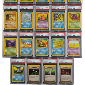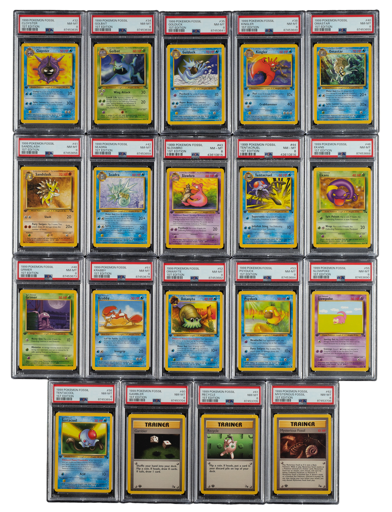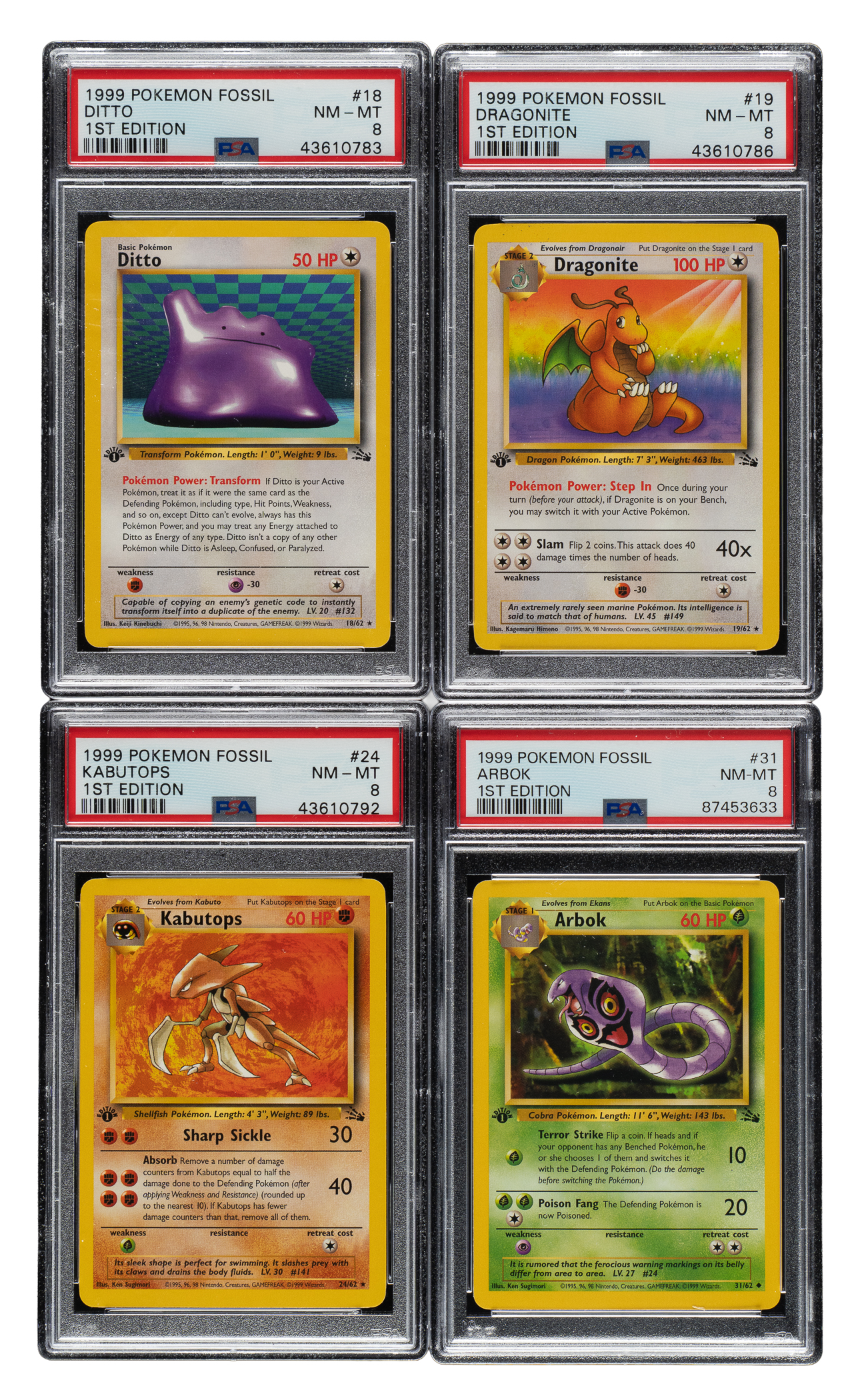 Collection of twenty-three 1999 Pokemon Fossil 1st Edition cards, each graded and encapsulated NM-MT 8 by PSA. The Fossil set is particularly significant in the Pokémon community as it represents the third and final series released by Wizards of the Coast in 1999, following the Base and Jungle sets that combine to feature the original 151 Pokémon. This collection consists of the following: #18 Ditto, 19 Dragonite, 24 Kabutops, 31 Arbok, 32, 34, 35, 38, 40, 41, 42, 43, 44, 46, 48, 51, 52, 53, 55, 56, 60, 61, and 62. Total 23 cards.