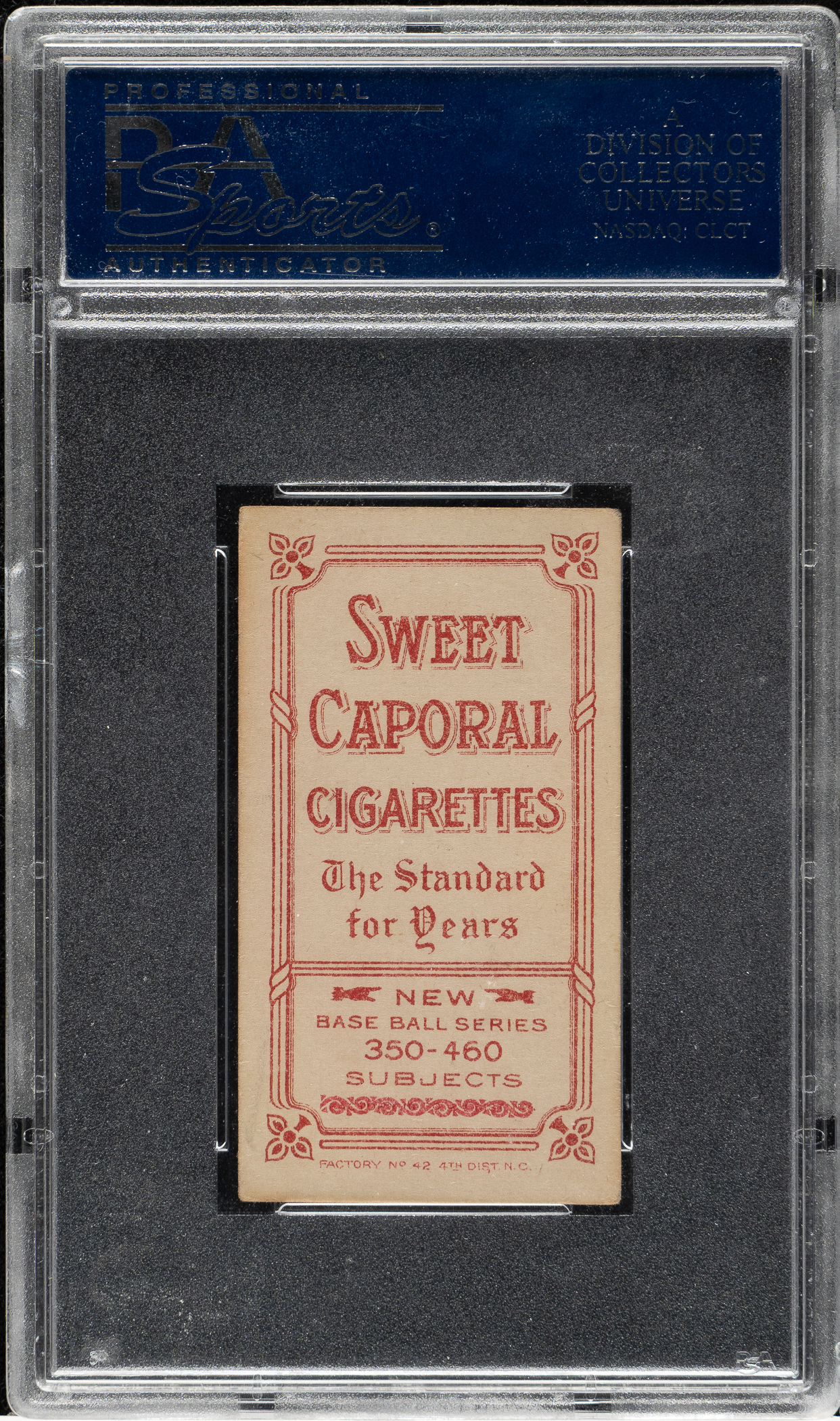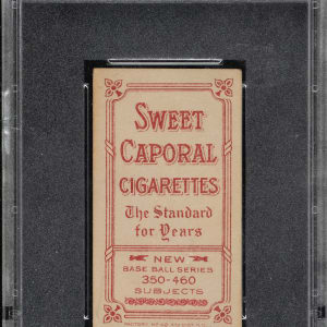 Graded EX 5 by PSA. Beautiful mid-grade example of one of New York Giants Hall of Famer Christy Mathewson’s classic cards. The T206 Mathewson dark cap pose is one of the most popular of all T206s and one of the most highly regarded of all Mathewson cards. This well-centered example has vibrant colors, excellent registration, and even corner wear. Boldly printed Sweet Caporal 350-460/42 advertising on reverse.