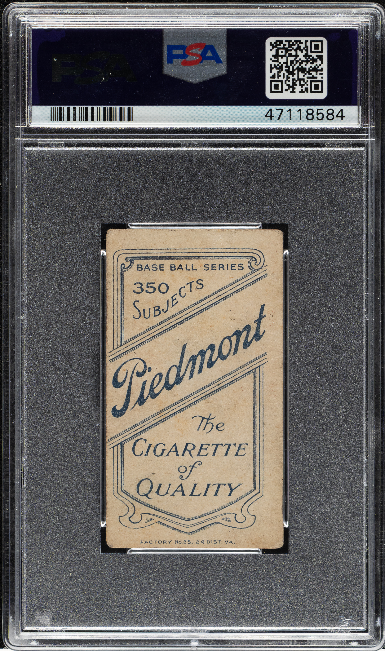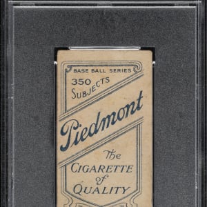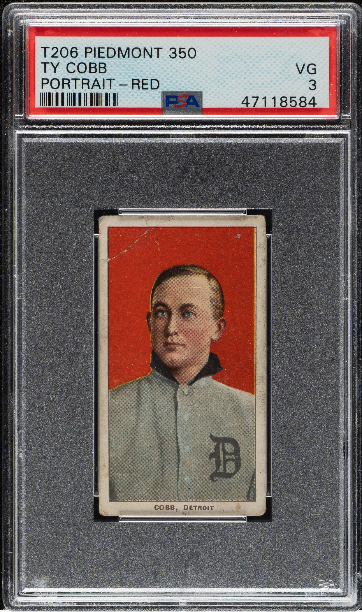 Graded VG 3 by PSA. Mid-grade example of one of Detroit Tigers Hall of Famers Ty Cobb's iconic cards. The red background pose has long been considered one of the classics of the T206 set and of all vintage cards. Bright and crisp with even corner wear. Boldly printed Piedmont 350 advertising reverse. An unobtrusive crease in the upper left contributes to the assigned grade.
