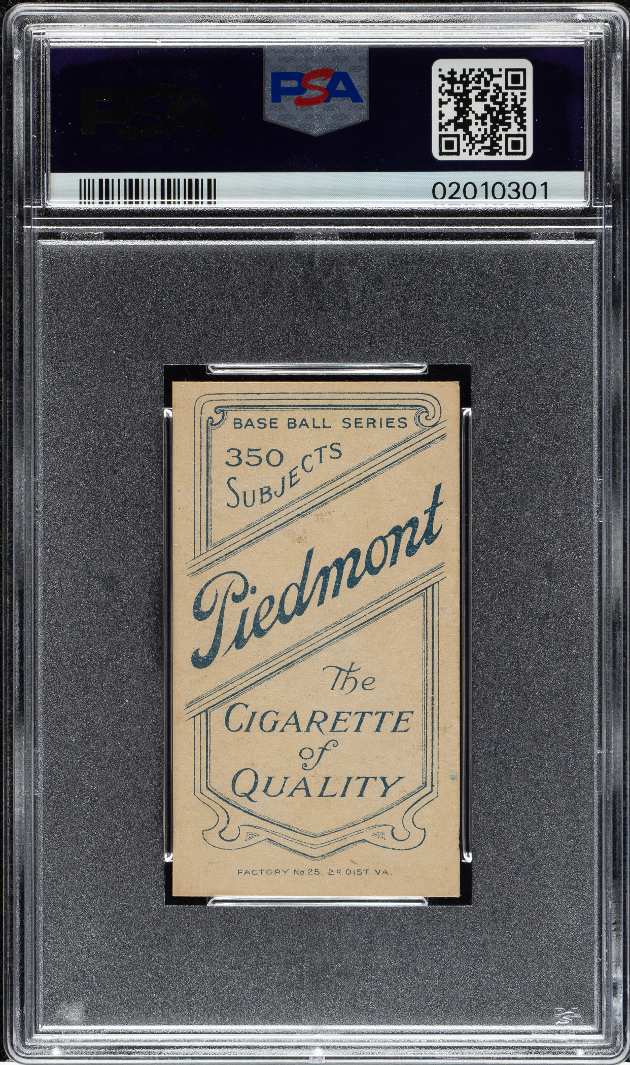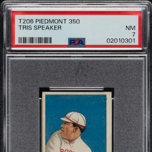 Graded NM 7 by PSA. Outstanding high-grade example of this classic tobacco card of Boston Red Sox Hall of Famer Tris Speaker. This is a particularly important Hall of Fame card in the set because this is the only T206 pose of Speaker. It is his rookie card as well. Bright, crisp, and clean, with beautiful colors and strong corners. The Piedmont 350 advertising reverse is clean and boldly printed. A tremendous example worthy of any high-quality T206 collection.