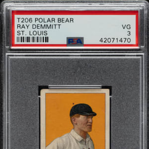 Graded VG 3 by PSA. Beautiful example of the rare Ray Demmitt, St. Louis, T206 variation. Polar Bear was the only company to issue this variation, no doubt contributing to its significant rarity. T206 cards issued with Polar Bear tobacco were not well protected from the accompanying product, so almost all Demmitts have significant condition problems, including at least some tobacco staining. This example, amazingly, has virtually no staining. The card displays brilliant colors, excellent registration, honest corner wear, and outstanding centering. The Polar Bear advertising reverse is boldly printed. A small wrinkle above Demmit's shoulder and a tiny spot of paper loss next to his pant leg contribute to the assigned grade. This is a strong example of one of the rarest and most condition-sensitive cards in the classic T206 set.