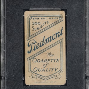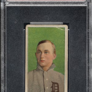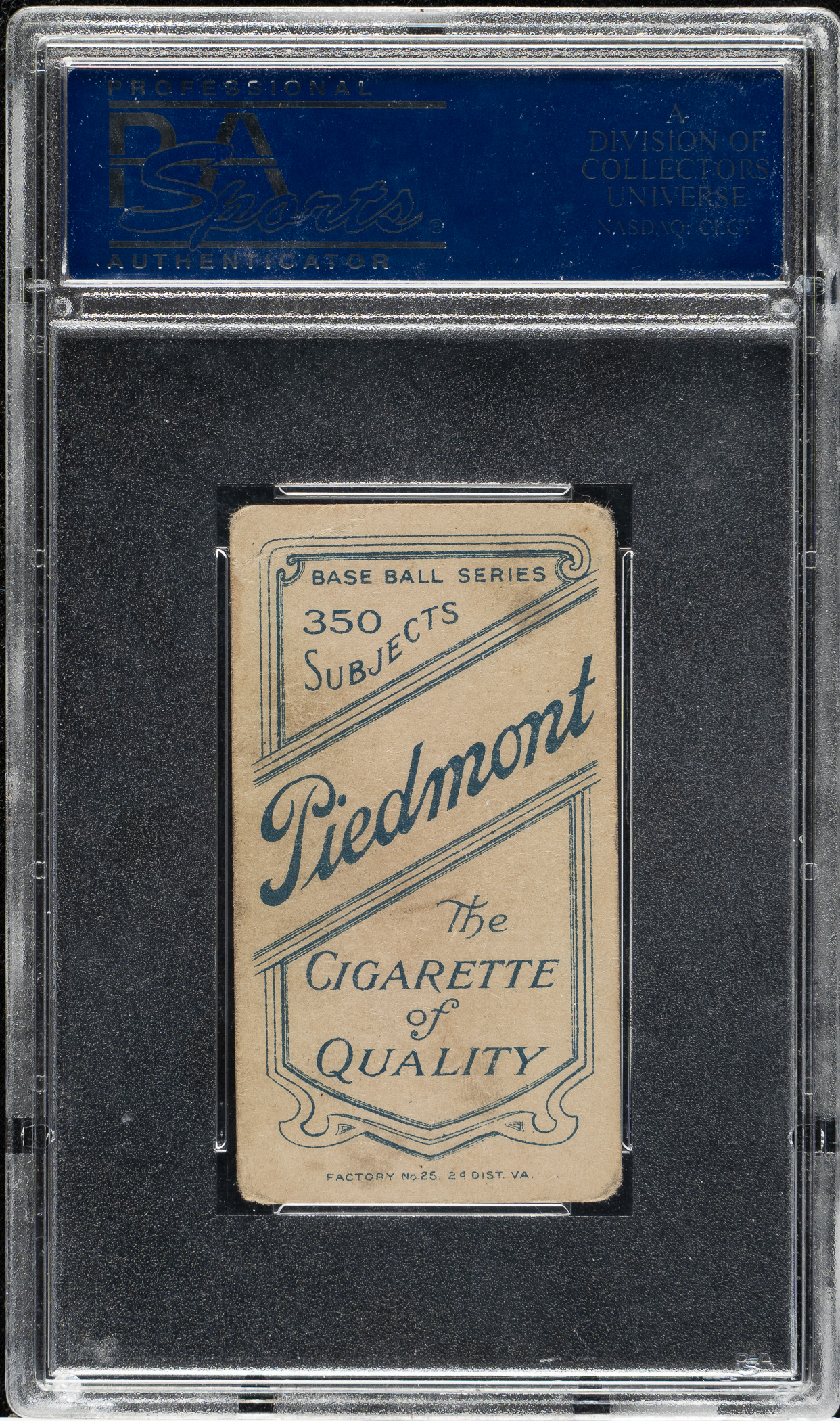 Graded VG 3 by PSA. Mid-grade example of this classic tobacco card of Hall of Famer Ty Cobb. The green background pose is considered the rarest of the four poses of Cobb in the T206 set. This well-centered example has a bright green background, a strong image, and moderate corner wear. Lightly soiled Piedmont 350 advertising reverse. An unobtrusive crease in the upper right contributes to the assigned grades. One of Cobb's most popular cards from the premier tobacco issue of the 1910 era.