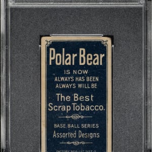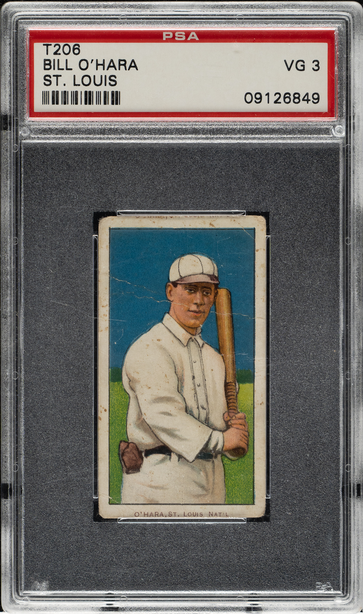 Graded VG 3 by PSA. Mid-grade example of the rare T206 Bill O'Hara card, St. Louis Browns variation. Polar Bear was the only company to issue this variation, no doubt contributing to its significant rarity. T206 cards issued with Polar Bear tobacco were not well protected from the accompanying product, so most O'Haras have significant condition problems, including at least some tobacco staining. This well-centered example displays brilliant colors, excellent registration, even corner wear, and scattered creasing. The Polar Bear reverse is boldly printed. It is interesting to note that a very small part of the nameplate "O'Hara, St. Louis" is visible along the top edge. Of course, it is the very fact that this card is miscut, with a portion of the name (and team designation) of the card above visible and providing insight into how the T206 set was printed, that will make this card particularly fascinating to many collectors. A very appealing example of one of the rarest and most condition-sensitive cards in the classic T206 White Border set.