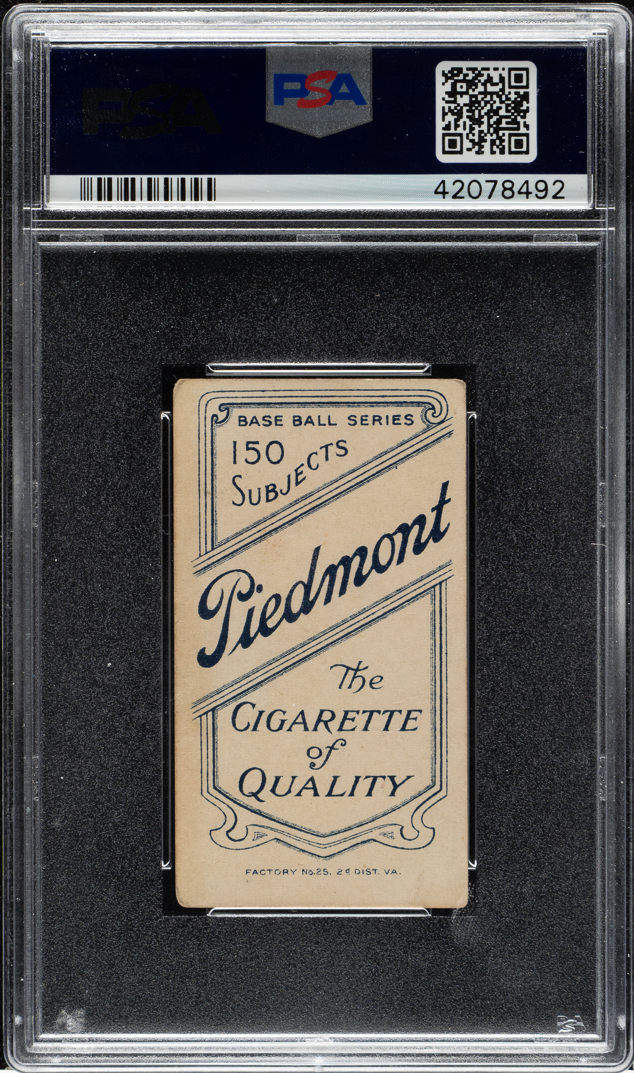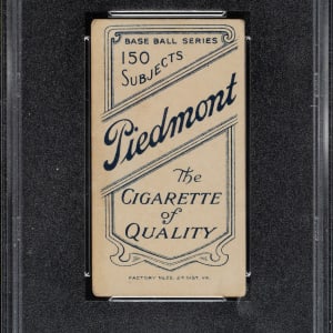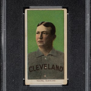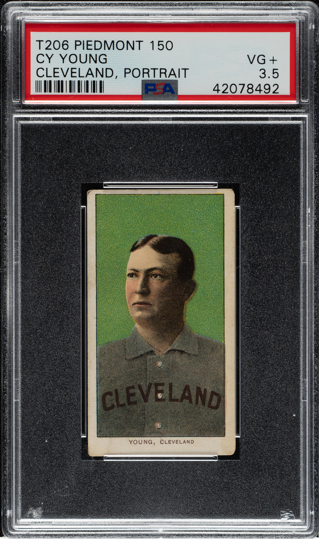 Graded VG+ 3.5 by PSA. Attractive mid-grade T206 example of Cy Young (portrait) set against a beautiful green background. This is one of Cy Young's most striking cards and one of the most popular cards in the entire T206 set. The offered card displays vibrant colors, a strong image, honest corner wear, and light discoloration along the right border. Clean and boldly printed Piedmont 150 advertising reverse.