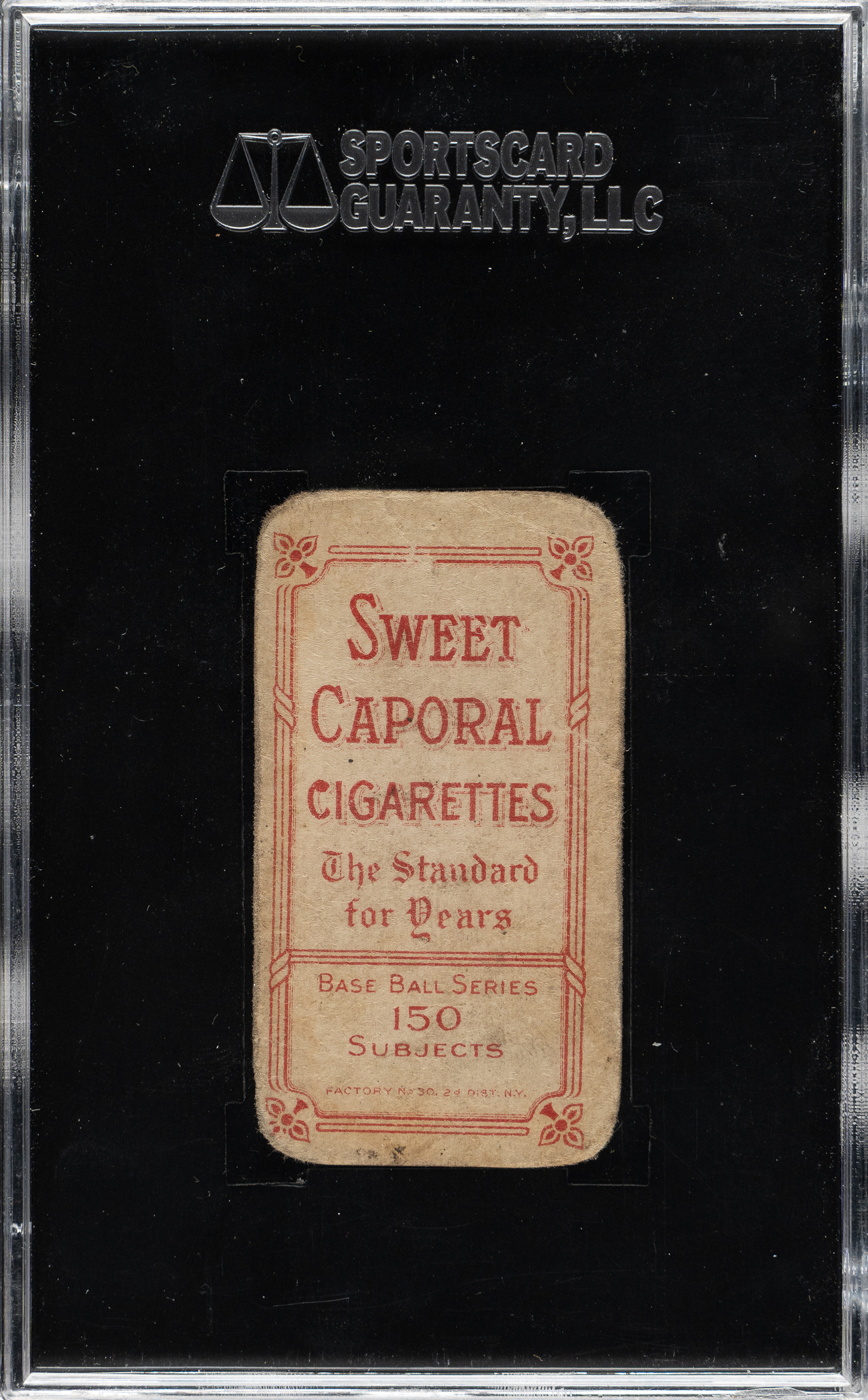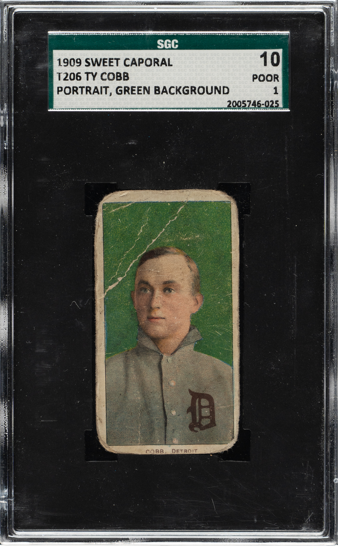 Modestly graded example of this classic tobacco card of Detroit Tigers Hall of Famer Ty Cobb. The green background portrait pose is the rarest of the four poses of Cobb in the T206 set. This example has a bold green background and a crisp image of Cobb. Graded POOR 10 by SGC, condition flaws include heavy creasing, rounded corners, and soiling. Despite these condition issues, this remains a presentable example of one of the key cards in the premier tobacco issue of the 1910 era.