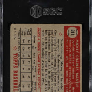 Modestly graded 1952 Topps #311 Mickey Mantle. One of card collecting's classics, Mantle's Topps rookie card is the key to the set, one of the most famous of all cards, and the single most popular and valuable baseball card. This well-centered example has beautiful colors and a bold blue background. The reverse is clean and boldly printed with crisp red and black colors. Graded POOR 1 by SGC, the card is largely downgraded due to scattered creasing. Iconic cards such as the 1952 Topps Mantle always have tremendous interest to collectors in all grades. Lower-grade examples are naturally more affordable, and it is precisely for this reason that lower-grade examples of important cards often have even more collectors interested in them! This card will be of enormous appeal to collectors looking to acquire a very presentable yet comparatively affordable example of the most popular and desirable postwar card ever produced.