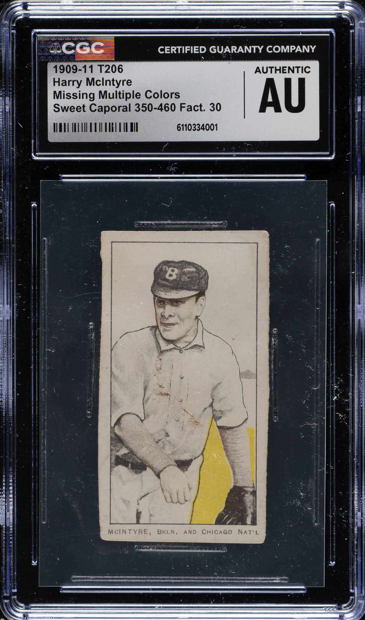 Presented is an extremely fascinating T206 printing error of Harry McIntyre, which has managed to escape several color processes and appears entirely different than a normal, completed color-process card. The offered card has been through only the first three steps of the color process: yellow (providing a base for the background), black (forming the border and player outline), and brown (responsible for the player name and team caption, as well as shading the image). The card bears a fully printed Sweet Caporal 350-460/30 reverse. Hand-cut and encapsulated as "Authentic" by CGC, this card presents well. Condition flaws include surface damage along McIntyre's jersey and several tiny spots of paper loss on the reverse. When it comes to the T206 set, which is the most highly collected of all vintage-card sets, anything unusual (especially if it might in any way shed light on the mysteries of how the T206 set was printed) is of great note. This is undoubtedly a noteworthy T206 printing error that we believe will be of great interest to T206 scholars and collectors. The T206 set, affectionately known as "The Monster," is the most popular of all 1910-era sets and is still yielding new and exciting discoveries more than a century after its production. As collectors have become more sophisticated, their appreciation for all great rarities and unusual cards associated with this landmark set has grown. Because of its uniqueness, there is no consensus on the value of a card such as this. We are confident the auction process will provide clarity. This extremely unusual, interesting, and very striking printing error from the T206 series is sure to be highly prized by collectors.