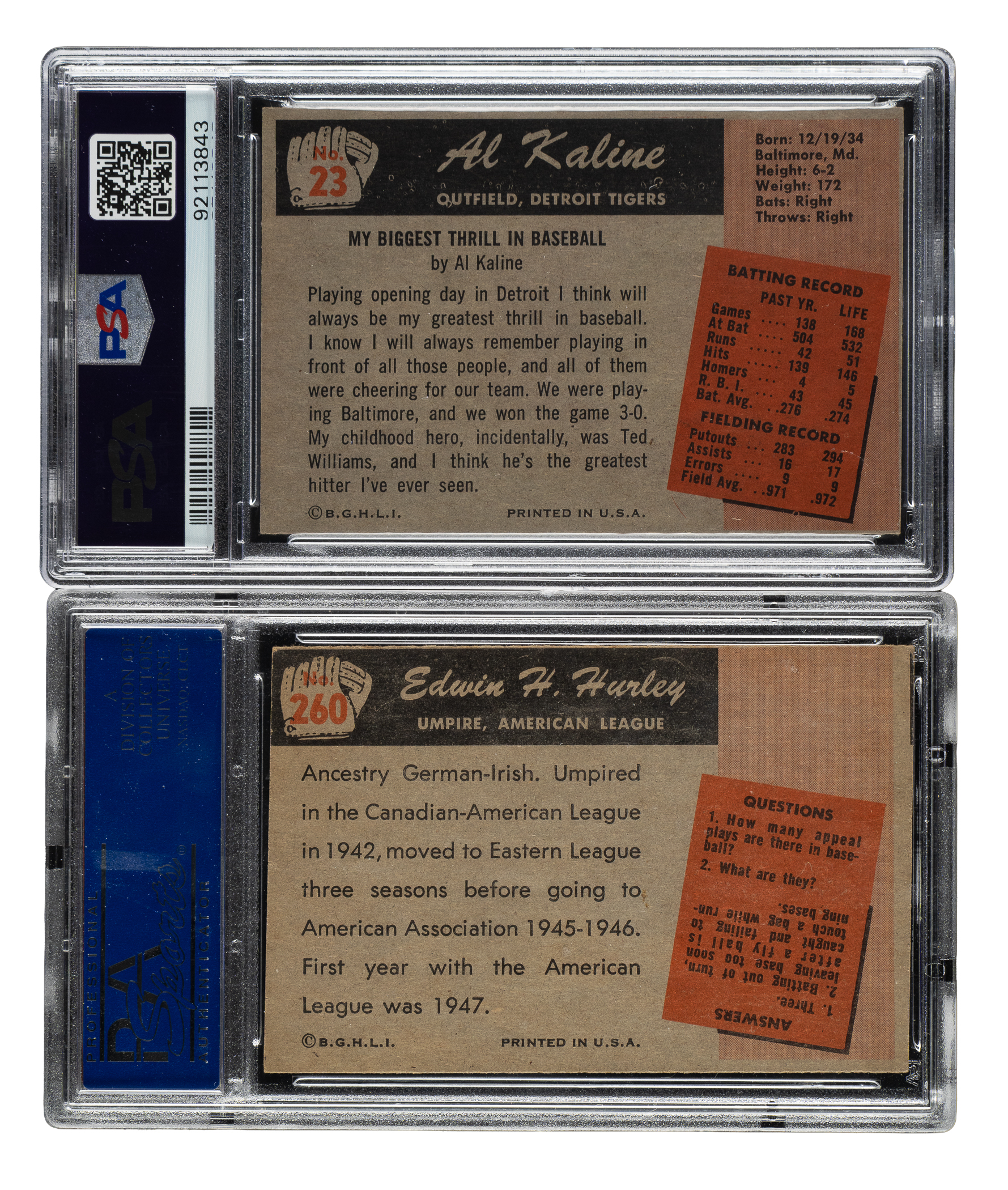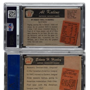 Pair of 1955 Bowman cards, featuring Detroit Tigers Hall of Famer Al Kaline. Both cards have been graded and encapsulated by PSA. This pair consists of the following: #23 Kaline (EX-MT 6) and 260 (EX 5). Total: 2 cards.